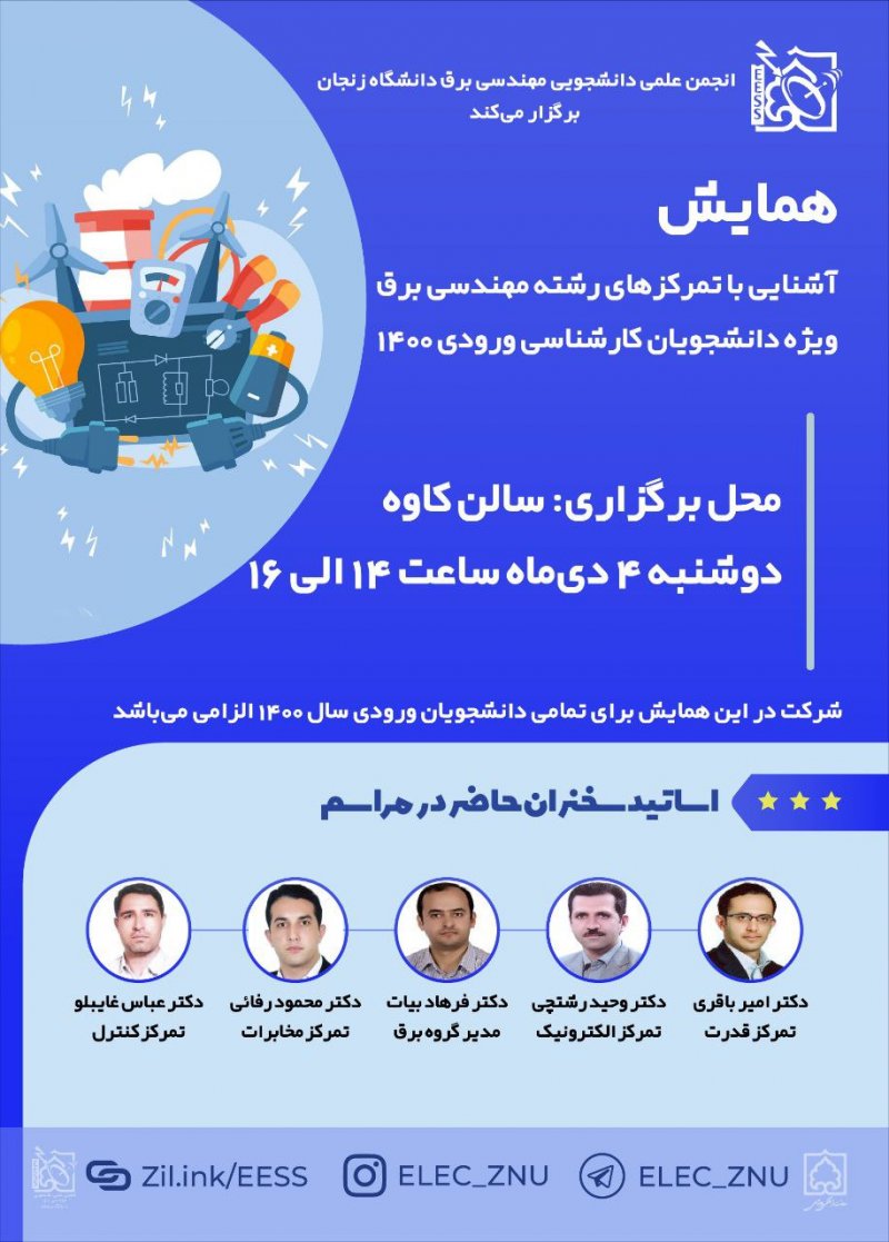 شورای مرکزی انجمن علمی مهندسی برق متشکل از نه عضو خود که تمامی اعضاء همانند سایر انجمنهای دانشگاه زنجان توسط فرآیند رأیگیری از میان دانشجویان رشتهی مهندسی برق انتخاب شدهاند. در اینجا، هدف ما از تمامی این فعالیتها این است که کمکی به دانشجویان محترم رشته مهندسی برق شود. برخی از این فعالیتها عبارتاند از برگزاری دورههای درسی، کارگاههای آموزشی، بازدیدهای صنعتی، وبینارهای امفت، سمینارهای مفید و کاربردی و همچنین نشریهی تسلامپ. در ادامهی صفحه میتوانید هم با فعالیتهای ما بهتر و بیشتر آشنا شوید و هم اینکه با ما در ارتباط باشید. همچنین میتوانید شمارهها و لینکهایی را که ممکن است زمانی به آنها نیاز پیدا کنید به سادگی در اختیار داشته باشید.
