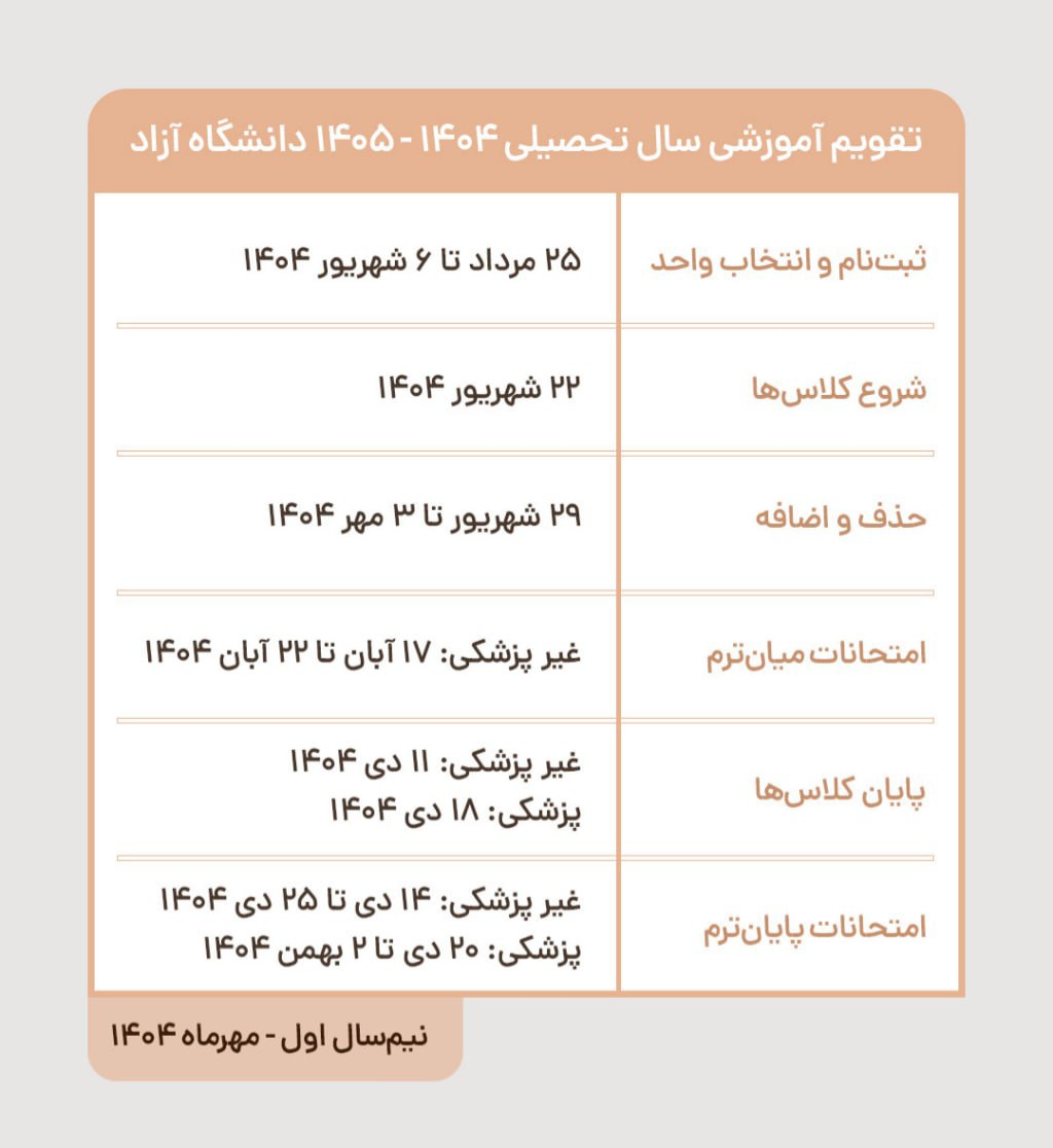 🔻 تقویم آموزشی پزشکی و غیر پزشکی نیمسال اول سال تحصیلی ۱۴۰۵-۱۴۰۴ دانشگاه آزاد اسلامی