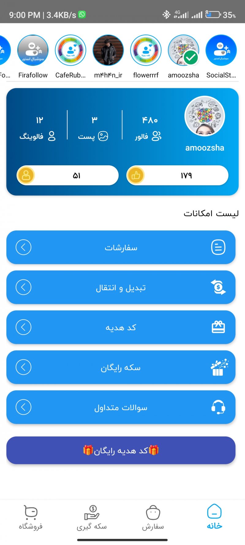 امکانات برنامه : ✓ ثبت کد هدیه.🎁 ✓پشتیبانی ۲۴ ساعته⏱ ✓ سرعت بالای ثبت سفارشات.🤩 ✓ امکان مشاهده ی وضعیت سفارش.📈 ✓ امکان جمع آوری سریع و ساده سکه.💰 ✓ امکان ثبت سفارش برای حساب های دیگر.🙋🏻♂️ ✓ کاملا رایگان 😘 و... خوب زود برو برنامه رو از کافه بازار یا از مایکت دانلود کن 😱😱