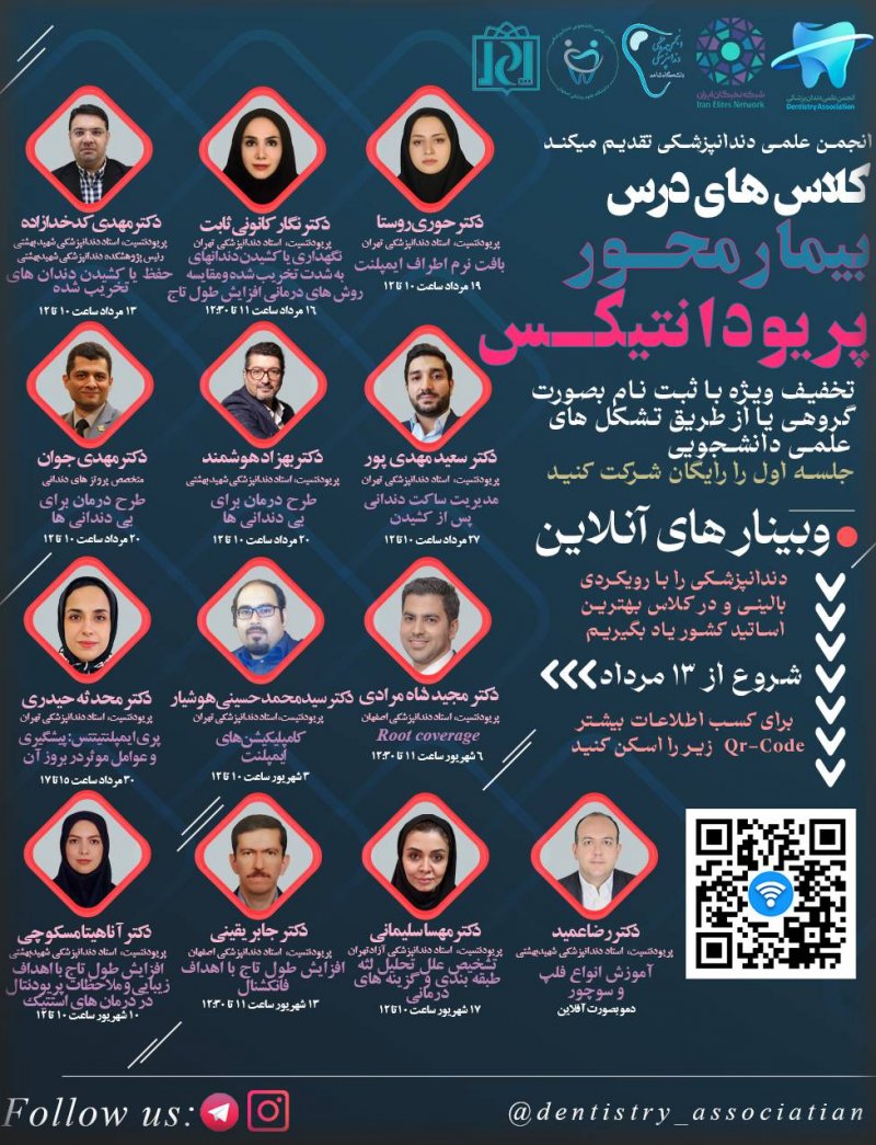 جزئیات سرفصلهای آموزشی دوره جلسه اول:حفظ یا کشیدن دندان های تخریب شده مدرس:دکتر مهدی کدخدازاده،استاد پریو دانشگاه علوم پزشکی شهید بهشتی جمعه ۱۳ مرداد ،ساعت ۱۰ محتوای کلاس به زبان استاد: یکی از چالشهای دندانپزشکان در مواجهه با دندانهای تخریب شده، ارزیابی مناسب سطح تخریب و تصمیمگیری برای حفظ یا کشیدن آنهاست. در این جلسه به بررسی شاخصهای مهم و تاثیر گذار در حفظ یا کشیدن دندانهای تخریب شده، سطح بندی تخریب آنها و ارائه رویکردی الگورتمیک برای درمان این دندانها خواهیم پرداخت. جلسه دوم:ارزیابی بیمار قبل از درمان ایمپلنت و زمان بندی قراردهی ایمپلنت مدرس :دکتر نگار کانونی ثابت ،استاد بخش پریو دانشگاه علوم پزشکی تهران دوشنبه ۱۶ مرداد ،ساعت ۱۱ محتوای کلاس به زبان استاد :ارزیابی بیمار قبل از درمان ایمپلنت شامل بررسی سلامت دهان و دندان، بررسی عمق لثه، سنجش ضریب استحکام استخوان، بررسی تاریخچه پزشکی بیمار و بررسی عوامل خطر از جمله سیگار، دیابت و بیماری های قلبی است. همچنین، زمان بندی قرار دهی ایمپلنت بستگی به شرایط بالینی بیمار دارد و معمولاً پس از انجام ارزیابی های لازم، پزشک معالج تصمیم می گیرد که آیا باید ایمپلنت در زمان فوری یا پس از درمان بعدی از جمله درمان لثه یا استخوان قرار داده شود. جلسه سوم :بافت نرم اطراف ایمپلنت مدرس:دکتر حوری روستا، استاد بخش پریو دانشگاه علوم پزشکی تهران پنج شنبه ۱۹ مرداد ،ساعت ۱۰ محتوای کلاس به زبان استاد :بافت نرم اطراف ایمپلنت شامل لثه، استخوان و بافت فکی هستند. بافت نرم اطراف ایمپلنت بسیار مهم است زیرا به خوبی به ایمپلنت متصل شده و ثابت نگه داشته میشود. هر گونه التهاب، عفونت یا نقص در بافت نرم میتواند منجر به عدم پذیرش چارچوب ایمپلنت شود و باعث مشکلات جدید در دهان شود.در این جلسه به این موضوع خواهیم پرداخت. جلسه چهارم:طرح درمان برای بی دندانی ها مدرسین:دکتر بهزاد هوشمند، استاد بخش پریودانتیکس دانشکده دندانپزشکی شهید بهشتی و دکتر مهدی جوان، متخصص پروتزهای دندانی جمعه ۲۰ مرداد ،ساعت ۱۰ محتوای کلاس به زبان استاد:درمانهای دندانپزشکی نیازمند دید چند جانبه میباشند و بررسی عارضههای دندانی از یک جهت موفقیت کامل را به همراه نخواهند داشت. در نتیجه بررسی تمام جوانب بی دندانی و عارضههای دندانپزشکی برای رسیدن به طرح درمان نهایی، امری ضروری است و در موفقیت، قابل پذیرش بودن و قابل دفاع بودن آن نقش کلیدی دارد. در این جلسه سعی میکنیم تا جنبههای مختلف رسیدن به یک طرح درمان موفق را بررسی کنیم. جلسه پنجم: مدیریت ساکت دندانی بعد از کشیدن مدرس: دکتر سعید مهدی پور ،استاد بخش پریو دانشگاه علوم پزشکی تهران جمعه ۲۷ مرداد ، ساعت ۱۰ محتوای کلاس به زبان استاد: یکی از مداخلات رایج در دندانپزشکی ، کشیدن دندان بدلایل رستوریتیو یا پریودنتال است که معمولا بهترین راه جایگزینی آن از استفاده از ایمپلنت است. از آنجا که حدود ۳۰-۶۰ درصد تحلیل استخوان ساکت دندان در ۶ ماه اول رخ می دهد لذا در Socket Preservation تلاش می کنیم تا با پیوند استخوان بلافاصله پس از کشیدن دندان، از تحلیل استخوان جلوگیری کنیم تا در آینده از نظر استتیک و فانکشنال امکان گذاشتن ایمپلنت بصورت مناسب وجود داشته باشد. جلسه ششم :پری ایمپلنتیتیس؛ پیشگیری و عوامل موثر در بروز آن مدرس:دکتر محدثه حیدری، استاد بخش پریو دانشگاه علوم پزشکی تهران دوشنبه ۳۰ مرداد ، ساعت ۱۵ محتوای کلاس به زبان استاد :در سال های اخیر با توجه به شیوع گسترده درمان ایمپلنت جهت جایگزینی دندان از دست رفته، شاهد افزایش موارد پری ایمپلنتیتیس در بیماران هستیم. در این وبینار سعی بر این است که روش های تشخیص و طبقه بندی بیماری های اطراف ایمپلنت، عوامل موثر در پیشگیری از بروز آن و درمان های غیرجراحی را بررسی کنیم. جلسه هفتم :کامپلیکیشن های ایمپلنت مدرس:دکتر سید محمد حسینی هوشیار،استاد بخش پریو دانشگاه علوم پزشکی تهران جمعه ۳ شهریور، ساعت ۱۰ محتوای کلاس به زبان استاد:ام