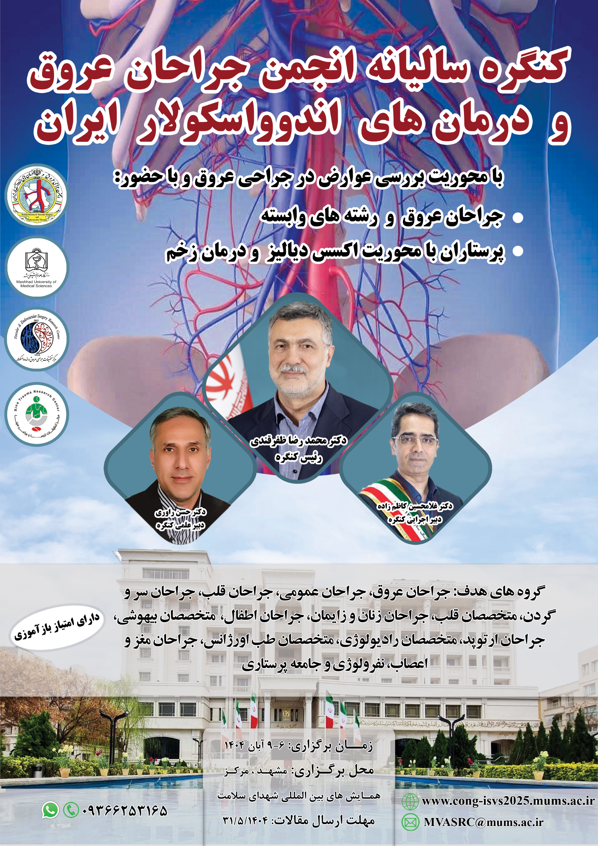 🔹 کنگره سالیانه انجمن جراحان عروق و درمانهای اندوواسکولار ایران 🔰 با محوریت بررسی عوارض در جراحی عروق و با حضور: 🟨جراحان عروق و رشتههای وابسته 🟨 پرستاران با محوریت اکسس دیالیز و درمان زخم ➕ به همراه برنامههای کمیته تحقیقات و فناوری دانشجویی دانشگاه علوم پزشکی مشهد و کمیته کشوری تحقیقات و فناوری دانشجویی ❇️ سمپوزیوم محققین جوان ❇️ هکاتون مدیریت عوارض جراحی عروق ❇️ پویش آگاهیبخشی عمومی شبه علم و سلامت عروق 🗓️ ۶ الی ۹ آبانماه ۱۴۰۴ 📍 مشهد - مجتمع شهدای سلامت (برج سپید)