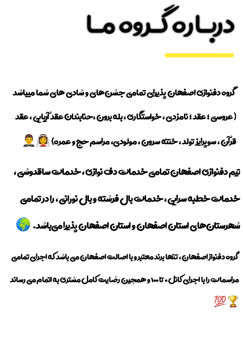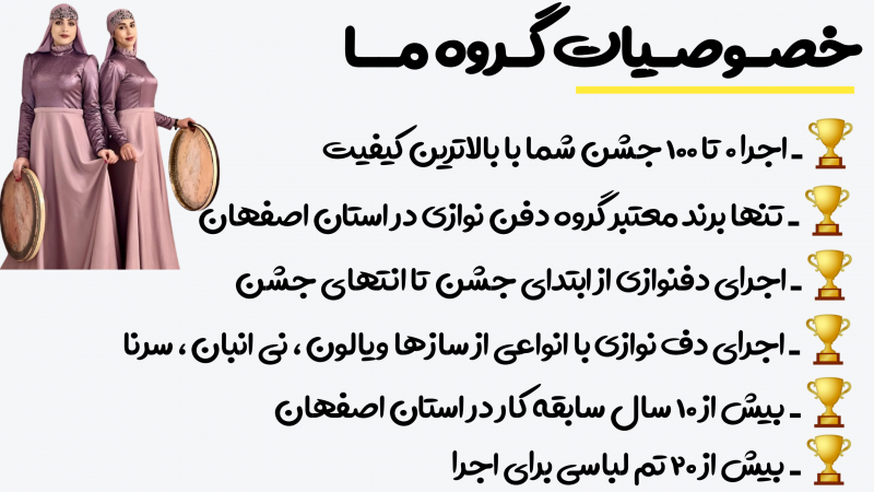 بله گروه دفنوازی ما در تمامی شهرستانهای استان اصفهان و خود شهر استان اصفهان و تمامی تالارهای استان اصفهان خدمات دهی دارد 💯