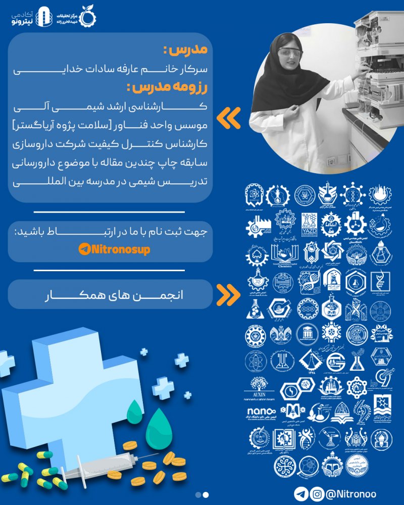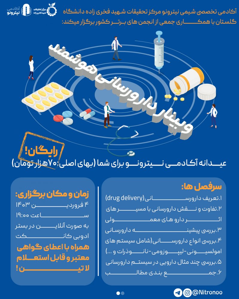 آکادمی تخصصی شیمی نیترونو مرکز تحقیقات شهید فخریزاده دانشگاه گلستان با همکاری جمعی از انجمنهای برتر کشور برگزار میکند 🌱 وبینار رایگان دارورسانی هوشمند عیدانه آکادمی نیترونو برای شما😍👇🏻 بهای اصلی: ۷۰هزارتومان ❗️به مناسبت سال جدید: رایگان❗️ همراه با اعطای گواهی معتبر و قابل استعلام لاتین💌 مدرس: 👩🏻🔬 سرکار خانم عارفه سادات خدایی کارشناسی ارشد شیمی آلی موسس واحد فناور [سلامت پروژه آریاگستر] کارشناس کنترل کیفیت شرکت داروسازی سابقه چاپ چندین مقاله با موضوع دارورسانی تدریس شیمی در مدرسه بین المللی برخی از سرفصلها:🔻 ۱-تعریف دارورسانی (Drug delivery) ۲- تفاوت و نقش دارورسانی با مسیرهای اثر داروهای معمولی ۳- بررسی پیشینهی دارورسانی ۴- بررسی انواع دارورسانی (شامل سیستمهای امولسیونی، لیپوزومی، نانوذرات و ...) ۵- بررسی چند مثال دارویی در سیستم دارورسانی ۶- جمع بندی مطالب زمان و مکان برگزاری: ⏰ ۴ فروردین ماه ۱۴۰۳، ساعت ۱۹:۰۰ به صورت آنلاین در بستر ادوب کانکت جهت ثبت نام از طریق باکس زیر با ما در ارتباط باشید
