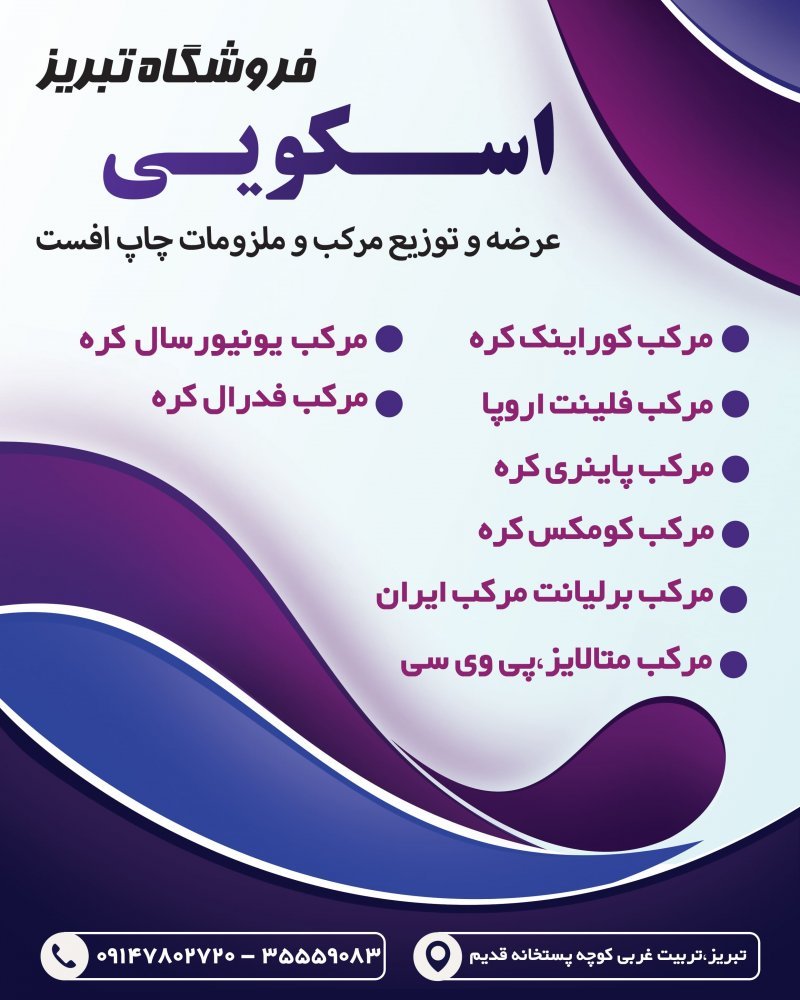 انواع مرکب ایرانی و خارجی(گلاسه و تحریر) انواع مرکب پنتون ، متالایز ، پی وی سی ، ترانسفر و یووی ۴ رنگ ایزوپروپیل الکل ساسول و مترون و الجی بلنکت ژاپنی ، آلمانی ، ایتالیایی ، چینی (زه دار،قواره ای،رول) سلفون حرارتی مات و براق شماره زن تمام فولاد لایبینگر آلمان انواع داروی آب ایرانی و خارجی انواع ماتریکس خط تا انواع چسب صحافی انواع زیر تیغ برش انواع پارچه نورد ورنی مات و براق ، دستکش نیتریل ، ضدچسب ، ضد پشت زن مرکب ، خشک کن مایع و خمیری ، صمغ بایگانی ، اس پی آ ، پودر خشک کن ، اسفنج ، کاردک ، پرفراژ ، روتوش زینک ، لاستیک فوتک ، لوپ ، طلق مرکبدان ، تیغه نوردشور ، چسب پایه ، پی ست و سایر ملزومات چاپ افست...