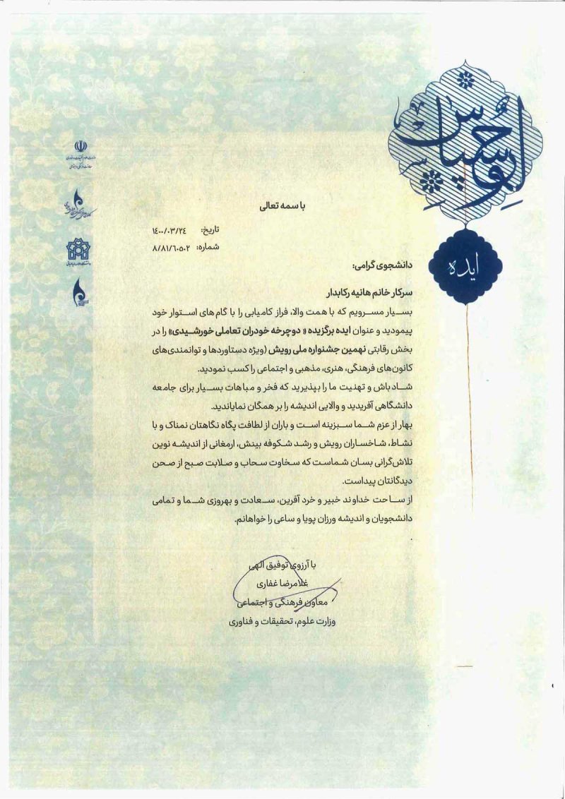 📌کارشناسی مهندسی برق گرایش قدرت 📌فناور برتر استانی و دانشجویی ۱۳۹۷🎖️ 📌 ثبت اختراع درحوزه انرژی پاک و سیستم های خودران 🌱💫 📌دارنده مدال از جشنواره بین المللی اختراعات کشور ترکیه 🥈 🇹🇷 📌دارنده مدال از جشنواره بین المللی اختراعات کشور سوئیس🥈 🇨🇭 📌عضو فدراسیون بین المللی مخترعین IFIA🏆 📌محقق وپژوهشگر برتر دانشجویی رویش ایران در سال ۱۳۹۹ 📝📚 📌سابقه کاری در طراحی ، ساخت و اجرای سیستم های الکترونیک ، هوا و فضا ، نیروگاه قدرت 🔌🛰️