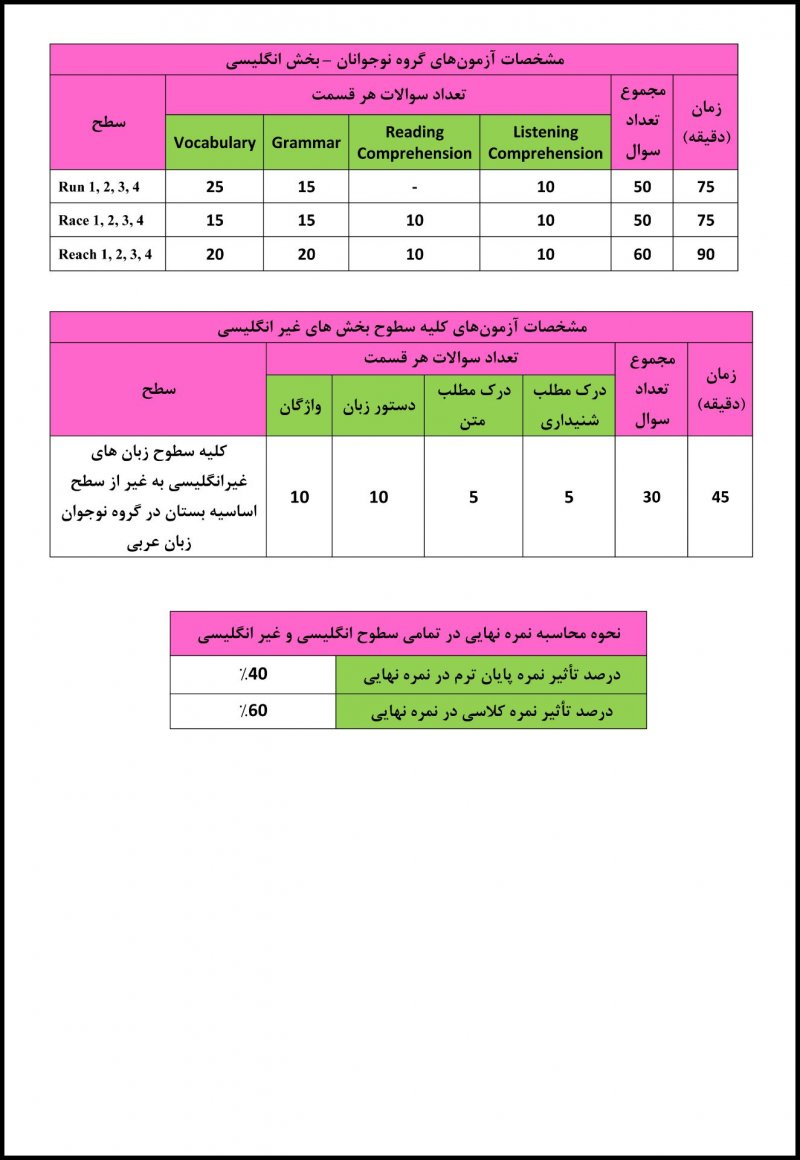 *زبان آموزان گرامی و پرتلاش کانون زبان ایران* ضمن آرزوی موفقیت برای تک تک شما عزیزان، جهت استفاده بهینه از کلاسهای آنلاین در طول ترم و کسب نتیجه مطلوب در پایان (یادگیری و قبولی) ، ذکر چند نکته ضروری است؛ ۱. تعداد جلسات مجاز غیبت موجه و غیرموجه درکلاسهای حضوری و انلاین در طول ترم 4 جلسه خواهد بود. البته توجه داشته باشید که جلساتی که با تاخیر طولانی یا تعجیل (خروج زودهنگام) در کلاس شرکت میکنید، نیز جزو جلسات غیبت محسوب خواهد شد. ۲. اگر به هردلیل، خواسته (دلایل شخصی) یا ناخواسته (مشکل سیستمی یا قطعی اینترنت) ناچار به خروج از کلاس شدید، حتما مدرس را از طریق چت باکس کلاس در جریان قرار دهید. ۳. اگر در طول کلاس با مشکل فنی (البته در صورت اطمینان از وضعیت مطلوب سرعت اینترنت خود) مواجه شدید، از طریق گزینه *تیکت* در سامانه کلاس آنلاین خود می توانید با پشتیبانی مشکلات خود را مطرح و بصورت آنی راهنمایی دریافت نمایید. حداقل سرعت لازم اینترنت شما آپلود ۱ و دانلود ۴ است که از طریق لینک speedtest.net قابل بررسی است. بنابراین قبل از هرگونه تماس با پشتیبانی سرعت اینترنت خود را بررسی بفرمایید. ۴. توجه داشته باشید که مشارکت فعال شما در کلاس با فعالیت کلامی (استفاده از میکروفن) پذیرفته بوده و صرف اتصال به کلاس و مشاهده اسامی شما عزیزان از طرف مدرس به عنوان حضور در کلاس قابل قبول نخواهد بود. ۵. جهت حفظ نظم کلاس و پیشگیری از اکو صدا، هم زمان با دیگر هم کلاسیها میکروفن خود را فعال نفرمایید. ۶. جهت استفاده از میکروفن روی علامت raise hand ✋ کلیک کرده و منتظر اجازه مدرس برای صحبت کردن بمانید. ۷. حتما قبل از شروع به صحبت از بالا بودن میزان صدا (volume) اطمینان حاصل کرده و بلافاصله پس از اتمام پاسخگویی، جهت شنیدن سایر دوستان خود، میکروفن را در حالت بی صدا (mute) قرار دهید. ۸. چند دقیقه زودتر از شروع کلاس در مکانی آرام و مناسب حاضر شده و سرعت اینترنت و هندزفری و بقیه ملزومات کلاس را چک بفرمایید. درصورت وجود سر و صدا در محیط اطراف شما، جهت حفظ نظم کلاس و تمرکز دیگر زبان آموزان، اجازه فعال نمودن میکروفن به شما در آن جلسه داده نخواهد شد و نمره فعالیت کلاسی آن جلسه را از دست خواهید داد. ۹. نمره کلاسی شما عزیزان (70 درصد از نمره نهایی) نقش اصلی در قبولی یا عدم قبولی شما خواهد داشت و این نمره برآمده از فعالیت شما در طول ترم و طی تمامی جلسات (نه صرفا در جلسات درس پرسیدن) خواهد بود. شما عزیزان 20 جلسه فرصت نشان دادن توانمندی و پیشرفت یادگیری خود در طول ترم را دارید. پس صرفا یک یا دوبار پرسش از شما ملاک قبولی نخواهد بود. ۱۰. فایلهای شنیداری (listening) قسمتهای مختلف درس در zil.ink/ilicd قابل استفاده میباشد. با توجه به اهمیت بالای تمرین در منزل جهت تقویت تلفظ و لهجه در صحبت کردن (speaking) و خواندن (reading) در کلاس، استفاده از این فایلها برای تمرین، هر جلسه قبل از حضور در کلاس ضروری بوده و باید بیشتر به آن اهمیت داده شود. ۱۱. از جلسات اول شروع ترم، فعالیت و یا عدم فعالیت شما توسط مدرس ثبت میشود و در صورت تکرار عدم فعالیت، به ناچار گزارشی به خانواده های این زبان آموزان، جهت پیگیری بیشتر والدین، ارسال خواهد شد. ۱۲. زبان آموزانی که گزارش به والدین را دریافت میکنند، تا پایان ترم میبایست با درخواست راهنمایی و مشاوره از مدرس خود (بدون موضع گیری غیر منطقی) و تلاش صد چندان، کاستیها را برای دریافت نتیجه مطلوب (قبولی) جبران نمایند. ۱۳. از شما زبان آموزان گرامی انتظار میرود با رعایت موارد ذکر شده با اعتماد به نفس کامل (بدون استفاده از کتاب و کمک دیگران) در آزمون آنلاین پایان ترم ( 30 درصد نمره نهایی) شرکت نموده تا متوجه میزان پیشرفت و یادگیری در طول هر ترم (نه صرفا صعود به ترم بالاتر) شوید. با تشکر از دقت و صبوری شما عزیزان
