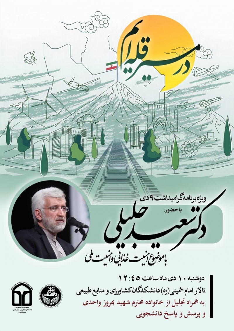 نشست تخصصی و نخبگانی با موضوع امنیت غذایی و امنیت ملی با سخنرانی «دکتر سعید جلیلی» 🔹دبیر اسبق و نماینده رهبری در شورای عالی امنیت ملی ایران 📆 دوشنبه ۱۰ دی ⏰ساعت ۱۲:۴۵ تالار امام خمینی(ره) دانشکدگان کشاورزی و منابع طبیعی 🔸بههمراه تجلیل از خانواده شهید بهروز واحدی 🔹️بههمراه پرسش و پاسخ دانشجویی