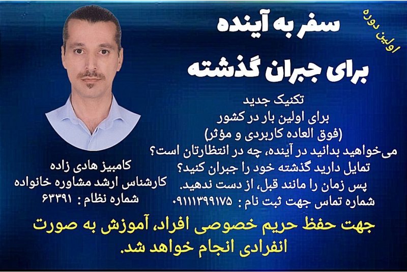💠 «سفر به آینده ، برای جبران گذشته» (تکنیک جدید برای اولین بار در کشور فوق العاده کاربردی و مؤثر) 🗓️ تاریخ برگزاری، طبق هماهنگی با شرکت کننده، اعلام میشود. 🔺 جهت حفظ حریم خصوصی افراد، آموزش به صورت انفرادی انجام خواهد شد. ⏰ مدت زمان آموزش ۱.۵ ساعت 🔵 هزینه ثبت نام ۷۰۰۰۰۰ تومان