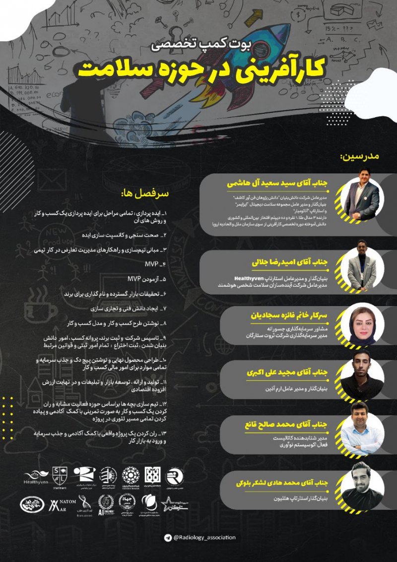 💥نخستین بوتکمپ تخصصی کارآفرینی حوزه سلامت در کشور ⭕️ انجمن علمی دانشجویی رادیولوژی و آکادمی استارلرن با همکاری استارتاپ ها و شتابدهنده های پیشرو حوزه سلامت کشور، بزرگترین دوره تخصصی تربیت کارآفرین سلامت را در کشور برگزار می نماید ⚜️ این بوت کمپ در سه سطح: ۱_آموزش کامل تئوری : شامل کلاس های آنلاین و دریافت فایل های مرتبط ۲_تیم سازی و آموزش کامل تئوری همراه با پروژه های عملی و راه اندازی استارتاپ تمرینی همراه با تمامی اصول با همیاری آکادمی ۳_ راه اندازی استارتاپ واقعی توسط تیم های منتخب همراه با حمایت معنوی و مادی ارگان های مرتبط و جذب سرمایه و رسیدن به اول کسب درآمد واقعی و توسعه استارتاپ تا مرحله بلوغ برگزار می گردد سرفصل ها: ۱) ایده پردازی: تمامی مراحل برای ایده پردازی یک کسب و کار و روش های آن ۲) صحت سنجی و کانسپت سازی ایده ۳) مبانی تیم سازی و راهکار های مدیریت تعارض در کار تیمی ۴) MVP ۵) آزمودن MVP ۶) تحقیقات بازار گسترده و نام گذاری برای برند ۷) ایجاد دانش فنی و تجاری سازی ۸) نوشتن طرح کسب و کار و مدل کسب و کار ۹) تاسیس شرکت و ثبت برند، پروانه کسب، امور دانش بنیان شدن، ثبت اختراع: تمام امور ثبتی و قوانین مرتبط ۱۰) طراحی محصول نهایی و نوشتن پیچ دک و جذب سرمایه و تمامی موارد برای امور مالی کسب و کار ۱۱) تولید و ارائه، توسعه بازار و تبلیغات و در نهایت ارزش افزوده اقتصادی ۱۲) تیم سازی شرکت کنندگان بر اساس حوزه فعالیت مشابه و ران کردن یک کسب و کار به صورت تمرینی با کمک آکادمی و پیاده کردن تمامی مسیر تئوری در پروژه ۱۳) ران کردن یک پروژه واقعی با کمک آکادمی و جذب سرمایه و ورود به بازار کار این بوت کمپ در ۳ پکیج (تمامی قیمت ها با ۵۰٪ تخفیف روز پزشک لحاظ شده اند) : ۱_آموزش کامل تئوری : شامل کلاس های آنلاین و دریافت فایل های مرتبط (۷۵۰/۰۰۰ تومان) ۲_تیم سازی و آموزش کامل تئوری همراه با پروژه های عملی و راه اندازی استارتاپ تمرینی همراه با تمامی اصول با همیاری آکادمی (۱/۵۰۰/۰۰۰ تومان) ۳_راه اندازی استارتاپ واقعی توسط تیم های منتخب همراه با منتورینگ کامل توسط آکادمی تا ورود به بازار کار و توسعه استارتاپ تا مرحله بلوغ و حمایت مادی و معنوی ارگان های مختلف و جذب سرمایه برای استارتاپ (۲/۵۰۰/۰۰۰ تومان) ⚠️توجه: 💯در همه پکیج ها در نهایت صاحب یک استارتاپ خواهید شد ✴️ ثبتنام گروهی بالای ۵ نفر مشمول ۲۰٪ تخفیف بر روی هر پکیج و بالای ۱۰ نفر مشمول ۳۵٪ تخفیف خواهد بود. ✴️ نمایندگان ورودی های مختلف جهت آگاهی از شرایط ویژه میتوانند با آیدی ارتباطی انجمن در ارتباط باشند. 🆔@Radiology_Association_Admin ✅ پس از واریز هزینه پکیج انتخابی جهت عضویت در چنل اختصاصی مربوطه به ادمین کانال پیام دهید.