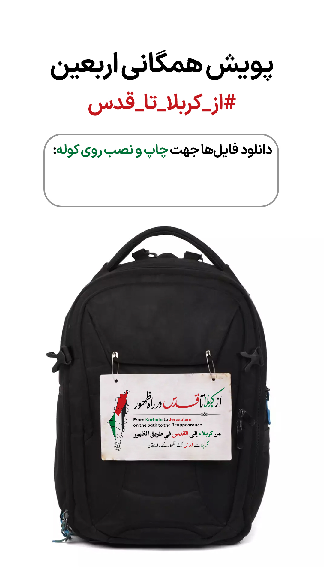 ۱️⃣ نصب برگه یا پیکسل، روی کوله یا لباس در راهپیمایی اربعین، تهیه عکس و نشر با هشتگ #از_کربلا_تا_قدس ۲️⃣ چاپ و پخش برگه های پویش در راهپیمایی اربعین، مواکب و..
