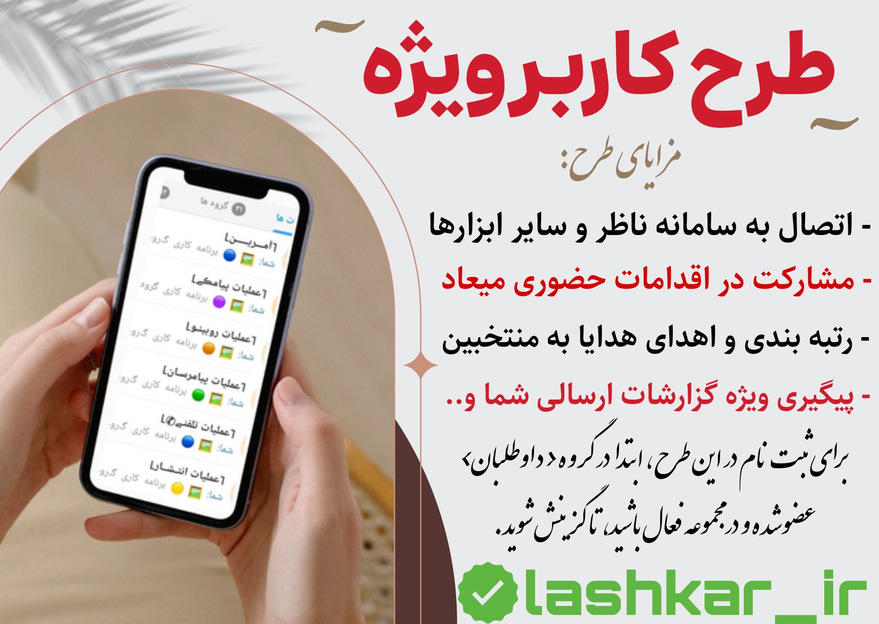 همونطور که از اسمش پیداست👀 این طرح شامل افراد فعال و پویای مجموعهاس بدینصورت که هرکسی در گروه های عملیاتی و جلسات صوتی حاضر باشه کاربر ویژه شناخته میشه ..✅ و اما مزیت های این طرح👇🏼 🚀پنل کاربری اختصاصی و رتبه بندی افراد 🚀دریافت گزارشات کشف حجاب ارسالی فرد و پیگیری موثر انها 🚀شرکت در عملیات های حضوری هر شهرستان 🚀ارائه انواع حمایت ها و خدمات شامل ، شارژ ، اینترنت ، هدیه نقدی ، هدیه فیزیکی ، و... https://eitaa.com/lashkar_ir/6973