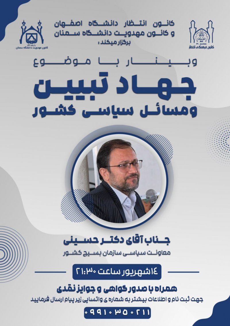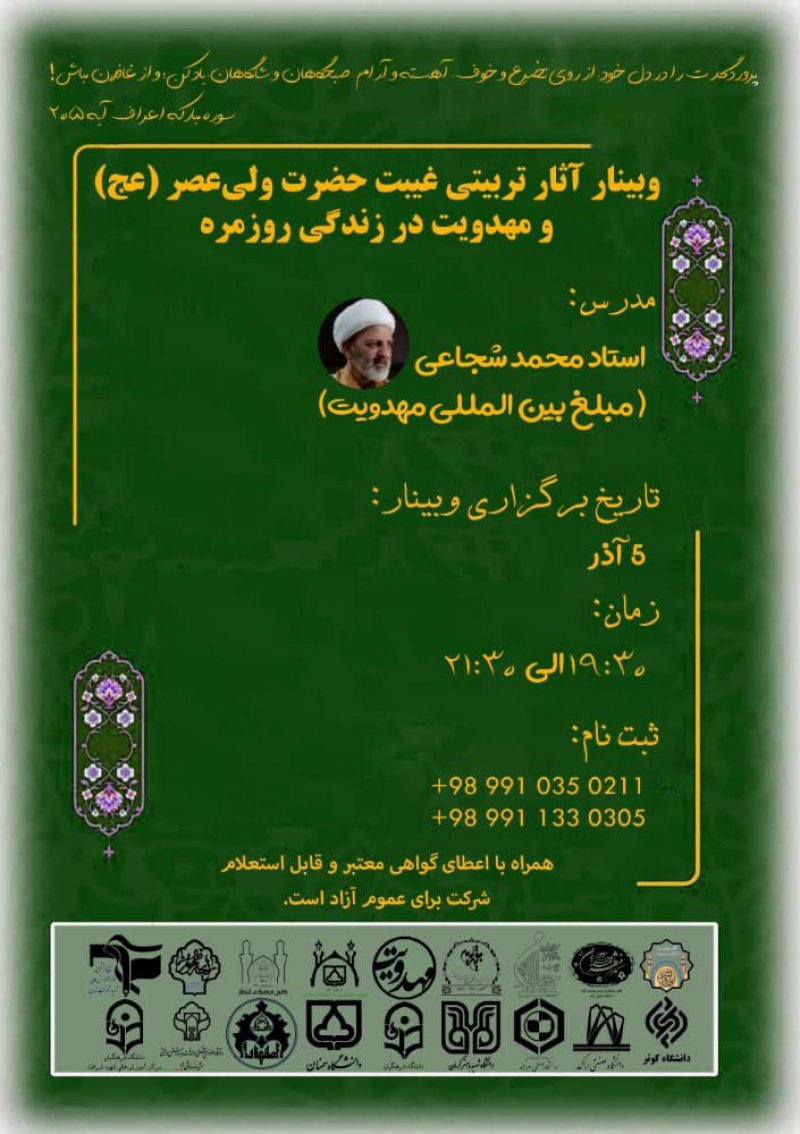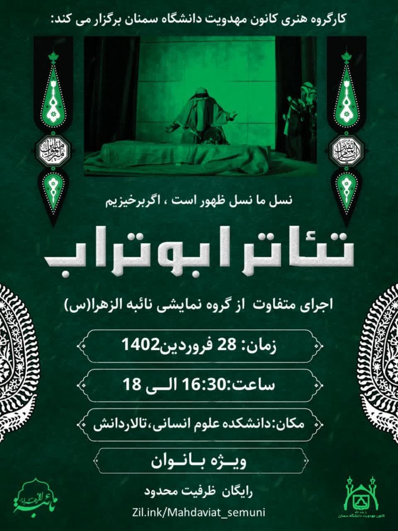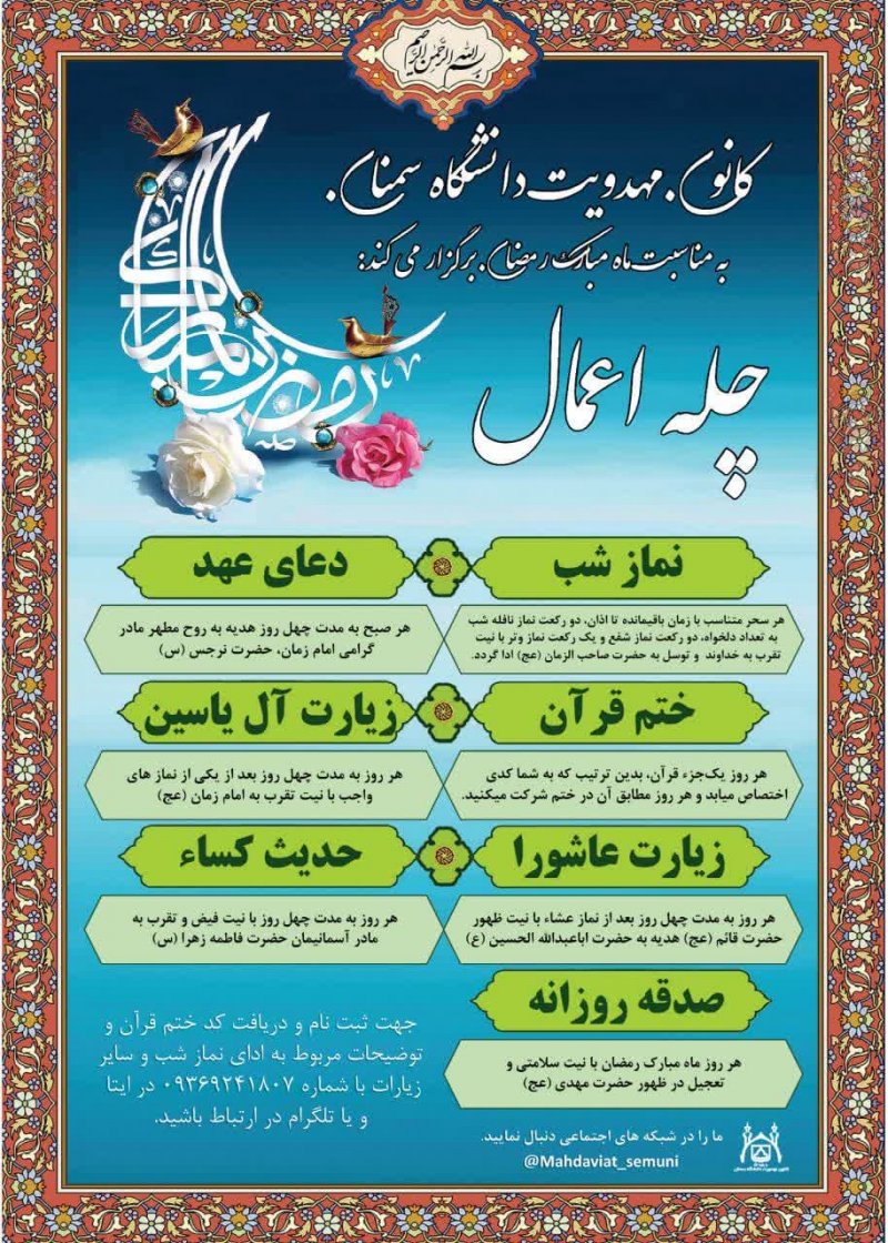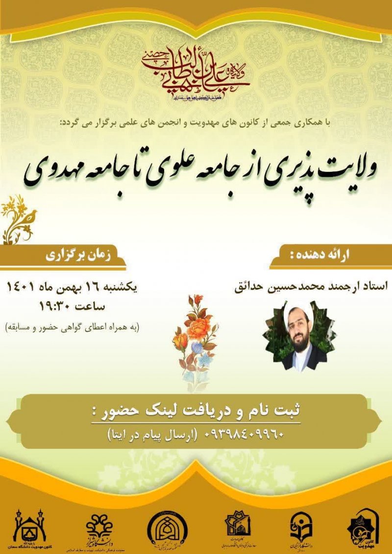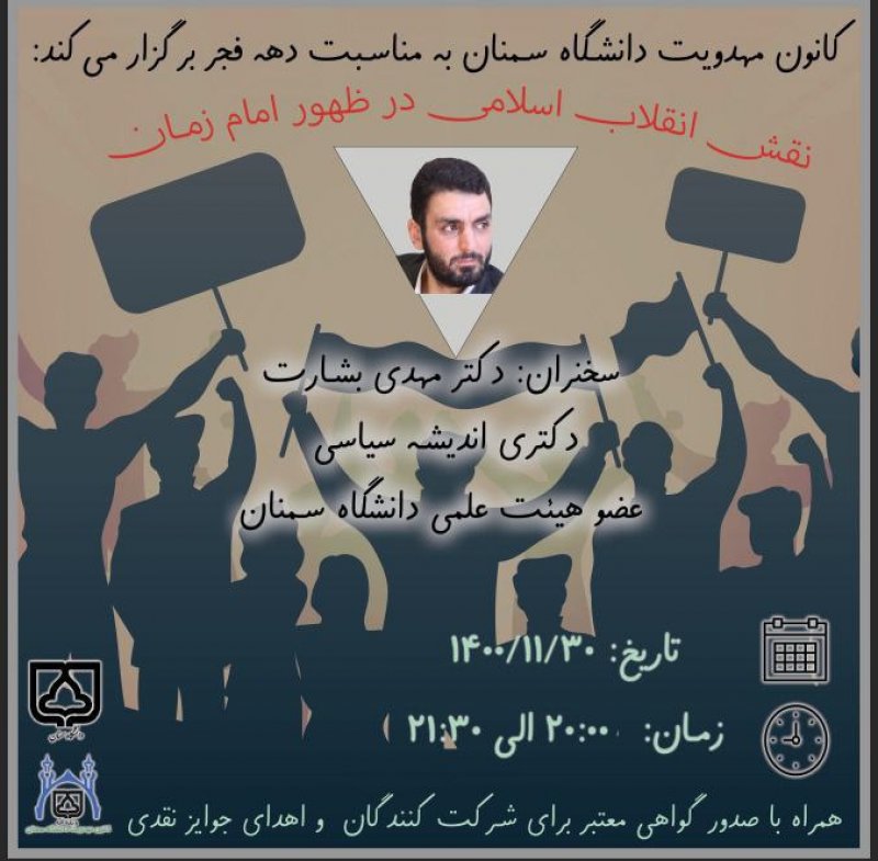 برای یادآوری عزیزترینی که در این مشغله های زندگی شده است غریب ترین ، میخواهیم یادی کنیم از کسی که همیشه به یاد ماست. لذا از شما منتظران ظهور ، دعوت می کنیم با عضویت در کانون مهدویت دانشگاه سمنان به جمعیت منتظران ظهور بپیوندید تا ان شاءالله با کمک یکدیگر در جهت تربیت خود و جامعه مهدوی قدمی هر چند کوچک در تعجیل فرج آقای غریبمان، حضرت مهدی صاحب الزمان (عج)، برداریم. .