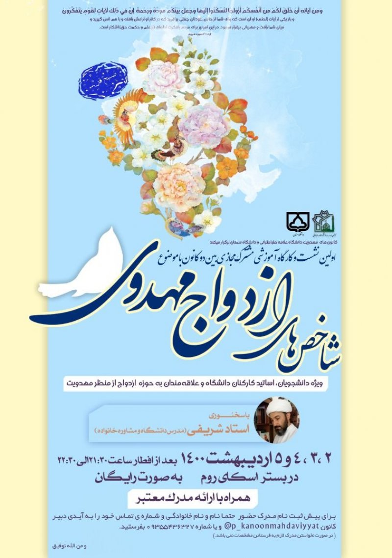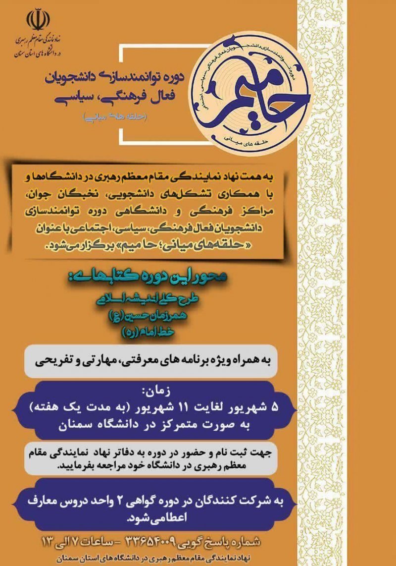 هر هفته سه شنبه ساعت ۲۰ در حسینیه خوابگاه های برادران و خواهران حلقه های مهدوی پیرامون مباحث مهدویت و مسائل روز کشور با هدف هم افزایی برگزار میگردد.