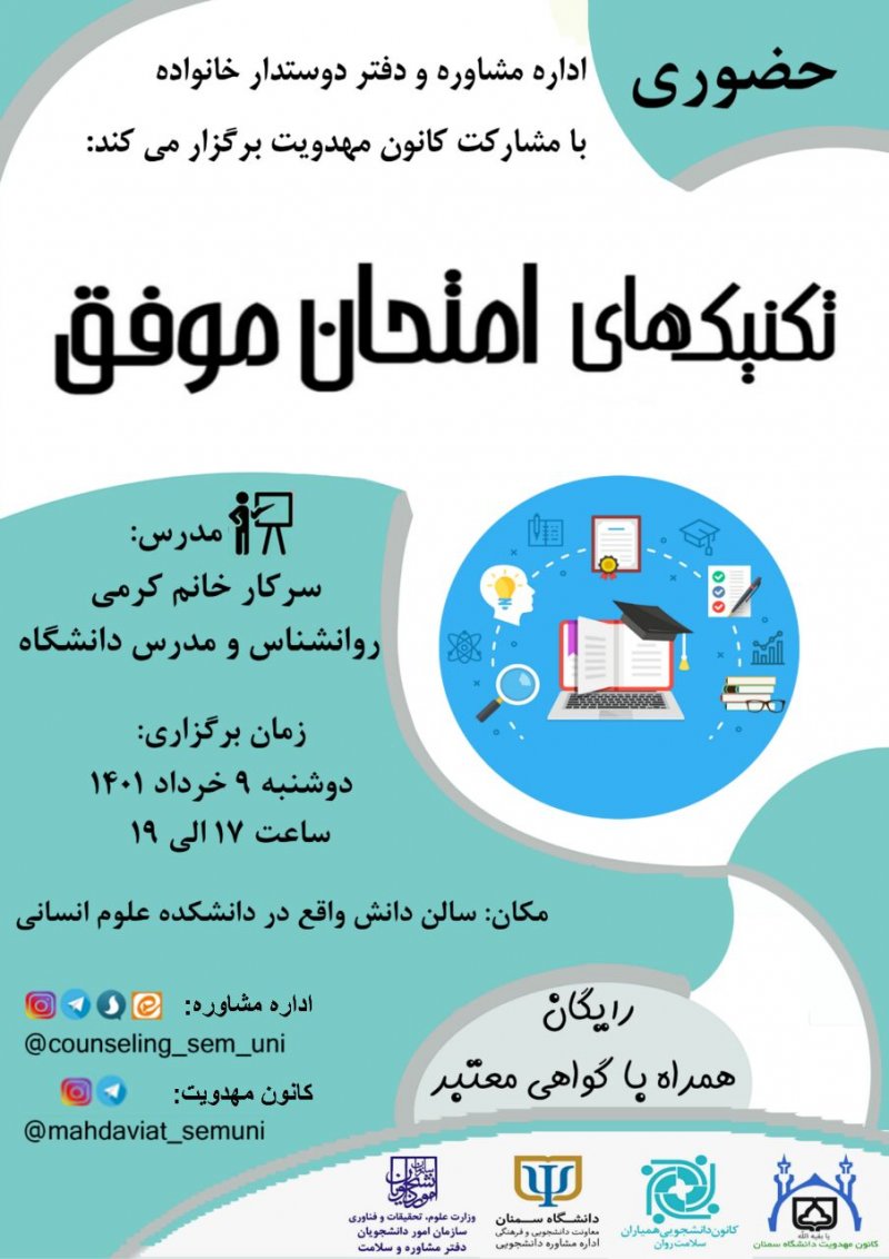 ۱- دانشکده مهندسی مکانیک - طبقه دوم - جنب راه پله سالن امتحانات - دفتر کانون مهدویت ۲- خوابگاه برادران فرهیختگان - بلوک ۲ - طبقه دوم - اتاق ۲۲۲ ۳- خوابگاه خواهران فرزانگان - بلوک ۱ - اتاق ۷۳۰