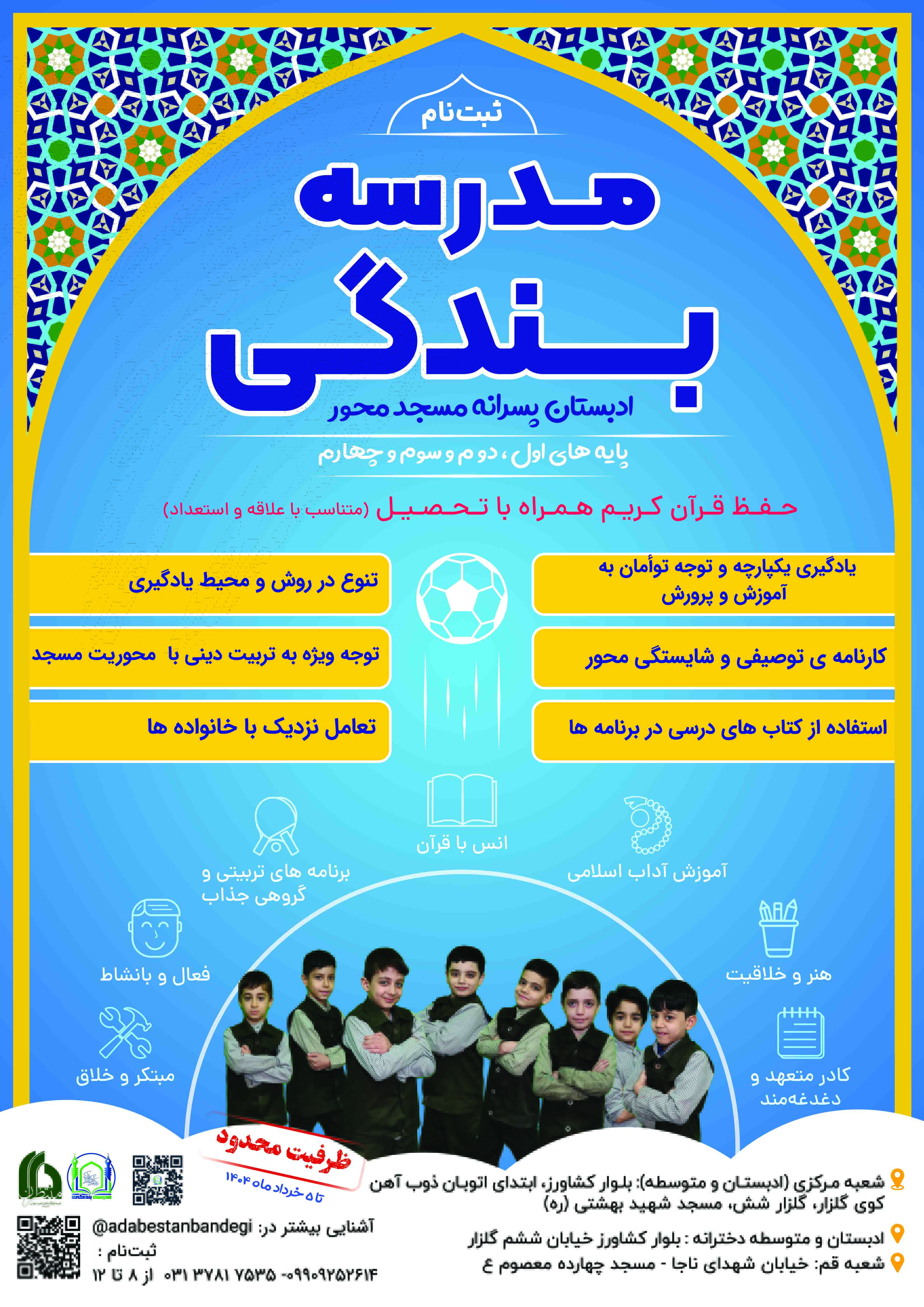 متربیان عزیز پسر ادبستان ، در کلاس های طبقه فوقانی شبستان مسجد شهید بهشتی ره هستند که شامل شش کلاس یک سالن نشاط (سالن بازی جسمی فکری) ، یک مهارت کده و کارگاه ویک سالن جلسات می باشد .