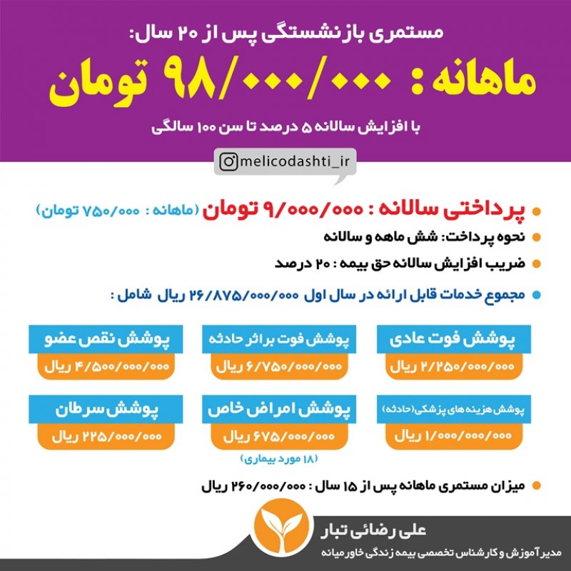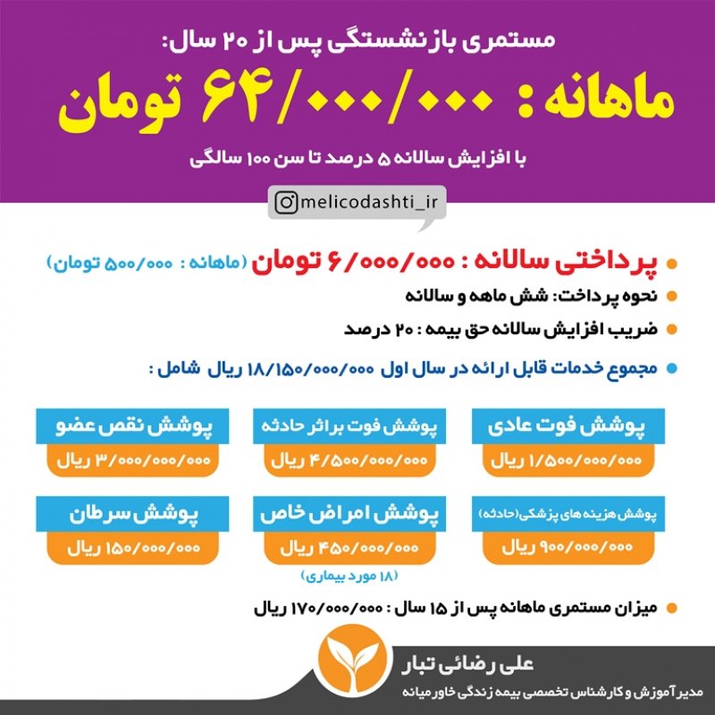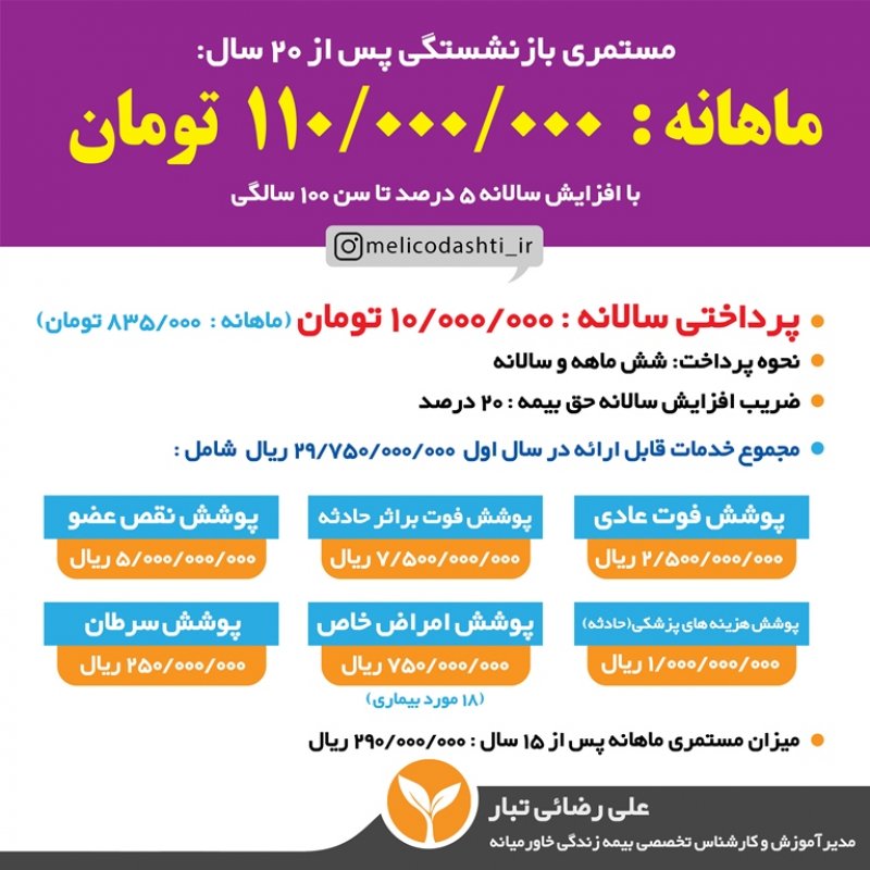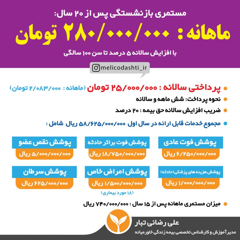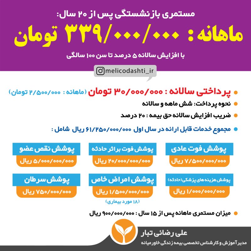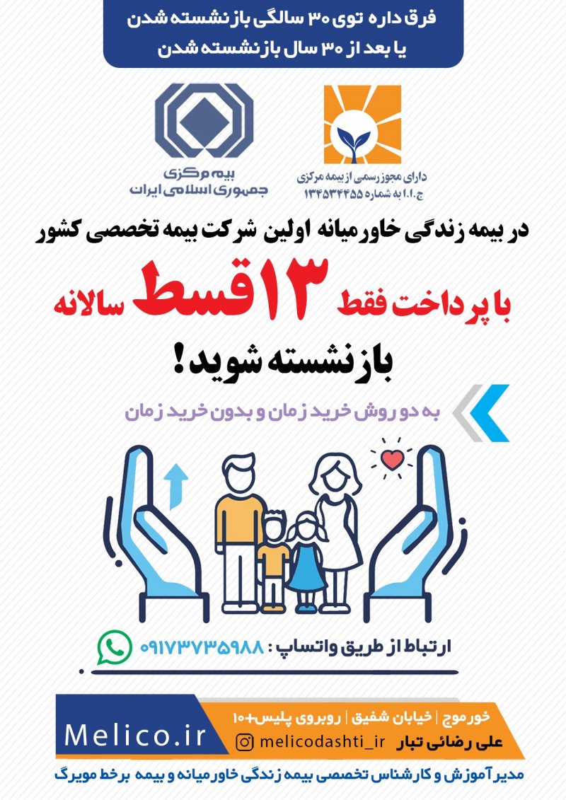 باسلام من علی رضائی تبار مدیرآموزش و کارشناس تخصصی بیمه زندگی خاورمیانه و کارگزاری بر خط مویرگ به همراه تیم قدرتمندم در کنار شما هستیم تا با ارائهی مشاوره ای جامع در زمینه بیمه های زندگی ، بهترین تصمیم را برای آینده خود و فرزندانتان بگیرید. اطلاعات و جداول بیمه تخصصی خاورمیانه در یازده بخش جداگانهی زیر خدمتتان ارائه میگردد: 🔷بخش اول: چرا بیمه زندگی؟ 🔶بخش دوم: چرا بیمه زندگی خاورمیانه؟ 🔷بخش سوم: خدمات و پوشش های درمانی 🔶بخش چهارم: جدول میزان مستمری (بازنشستگی) در خاورمیانه 🔷بخش پنجم: نظام بانکی بیمه خاورمیانه 🔶بخش ششم: بازنشستگی کوتاه مدت ۵ الی ۲۰ ساله 🔷بخش هفتم: مقایسه بیمه تامین اجتماعی و بیمه خاورمیانه 🔶بخش هشتم: پاسخ به سؤالات متداول مشتریان 🔷بخش نهم: طرح های ویژه بیمه برخط مویرگ در زمان مناسب که وقت کافی داشتید بررسی فرمایید و اگر نیاز به راهنمایی داشتید از طریق واتساپ در خدمت شما خواهم بود همچنین می توانید از قسمت راه های ارتباط با ما اطلاعات خود را نسبت به این بیمه و محصولاتش تکمیل نمایید.