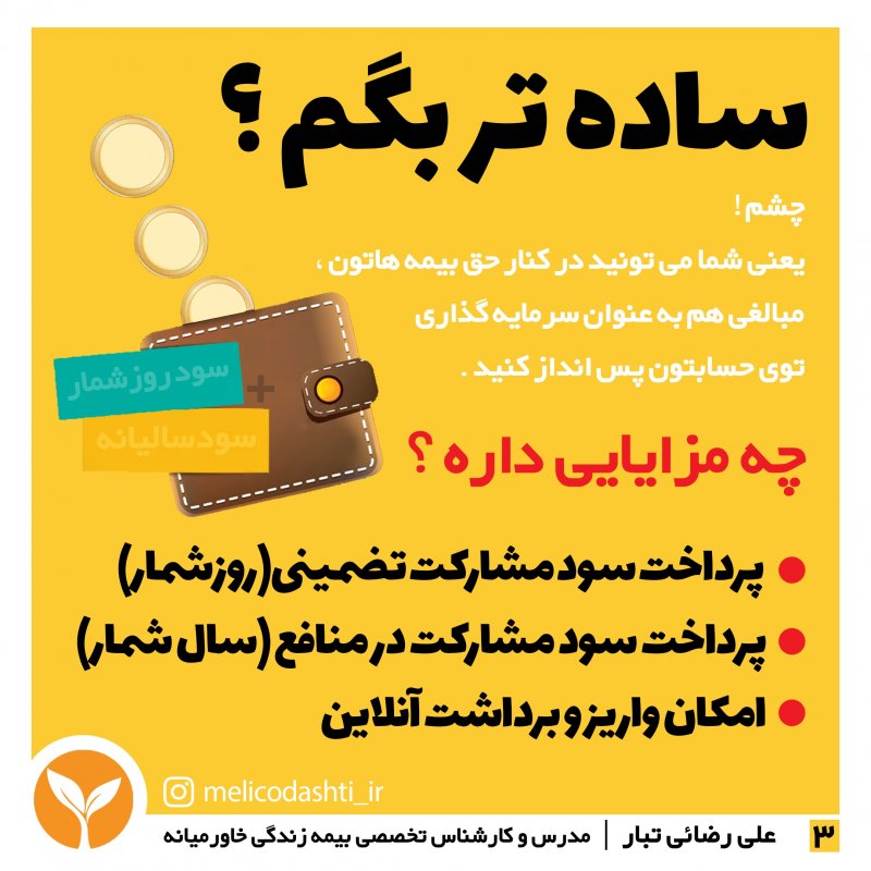 بیمه زندگی یک کالای غیرملموس و اما ضروری برای همهی افراد جامعه است که نمودِ خود را هم در زمان شادی و هم در زمان حوادث، پیشامدها، گرفتاری و سختیها و از همه مهم تر دوران بازنشستگی که دوران استراحت و راحتیست نشان می دهد. در واقع بیمه زندگی ، دارای دو بُعد پوشش ها و مستمری مادام العمر است که هم در زمان حال و هم در زمان آینده میتواند به یاری شما بشتابد . شما با تهیه بیمه نامه زندگی و مستمری مادام العمر قادر خواهید بود ضمن تأمین نیاز امروز ، فردای خود و فرزندانتان را تضمین نمایید و درآمدی مستمر و پایدار تا سن ۱۰۰ سالگی داشته باشید. *و اما چرا باید بیمه زندگی را برای خود و فرزندانمان تهیه نماییم ؟* دلایل بسیار زیادی باعث میشود تا همهی ما اعم از کارمند ، کارگر ، بانوی خانه دار ، کودک ، دانش آموز و ... نسبت به تهیه این سند مهم اقدام کنیم ولی در ادامه به مهم ترین آن ها خواهیم پرداخت : 🔹اگر برایمان مهم است که دوران بازنشستگی برایمان دوران *حلاوت* باشد نه دوران *مرارت* و سختی دوباره ! 🔹اگر ما در دوران بازنشستگی و بعد از سال ها تلاش و کوشش ، بجای پرداختن به شغل دوم، نیاز به تفریح ، سفر و آرامش داریم . 🔹 اگر به تحصیلات فرزند دلبندمان اهمیت میدهیم و میخواهیم مخارج تحصیلی فرزندمان را تا رسیدن به مدارج عالی بدون دل نگرانی پرداخت کنیم. 🔹 هزینه های فرزندان ما با رشدشان ، رشد خواهد کرد هرگز دوره پیری، ناتوانی و بازنشستگی زمان مناسبی برای تأمین این نیازها نخواهد بود پس از هم اکنون و در سن جوانی باید تدبیر و چاره ای بیندیشیم. 🔹 قطعاً تأمین آرامش و آسایش خانواده مان از ضروریات و اولویت های همه ماست . اگر تامین کردن آینده خانوادهمان اعم از سلامت، ازدواج، جهیزیه، اشتغال، مسکنِ فرزندانمان به عهدهی ماست. 🔹اگر دل نگران دوران ناتوانی و از کار افتادگی خود هستیم. 🔹اگر احساس می کنیم به بیمه مکمل و تکمیلی برای بیمههای درمانی نیاز داریم. *ما به شما بیمه ی مستمری و بازنشستگی تکمیلی خاورمیانه را توصیه میکنیم.* 🌹😍 دوست عزیزم و پدرِ عزیزِ خانواده😇 *آینده را جـــدی بگیرید* *فردایتان سپاسگزار تصمیم امروزتان است* ـــــــــــــــــــــــــــــــــــــــ ✍🏼علےرضائےتبـــار مدیرآموزش و کارشناس تخصصی بیمہےزندگےخاورمیانہ و بیمہ برخط مویرگ 📞 09173735988 📩 https://zil.ink/melicodashti_ir