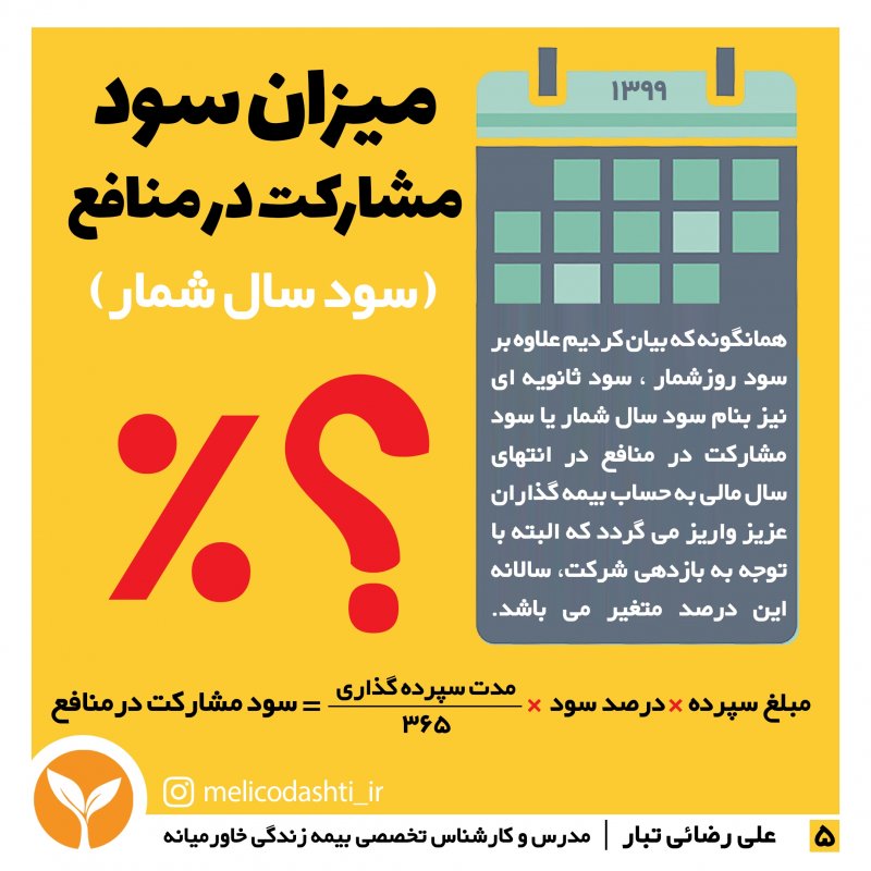 پاسخ: - بر اساس آخرین اعلام بیمه مرکزی(آیین نامه ۶۸/۲)، نرخ سود تضمینی برای دو سال اول بیمهنامه ۱۶ درصد، سال سوم و چهارم برابر ۱۳ درصد و از سال پنجم تا انتهای مدت بیمهنامه ۱۰ درصد میباشد. طبق ماده ۱۱ آیین نامه ۶۸ مصوب شورای عالی بیمه به کلیه ذخایر ایجاد شده علاوه بر پرداخت سودهای تضمین شده، سالانه ۸۵% سود حاصل از سرمایهگذاریهای شرکت بهعنوان سود مشارکت در منافع به بیمهگذاران پرداخت میگردد. هر ساله شرکت بیمه زندگی خاورمیانه پس از برگزاری مجمع عمومی شرکت (تیرماه)، مجموع سود مشارکت در منافع و سود تضمینی را تحت عنوان سود قطعی اعلام و به بیمهگذاران پرداخت مینماید که در پورتال بیمهگذاران نیز قابل مشاهده است.