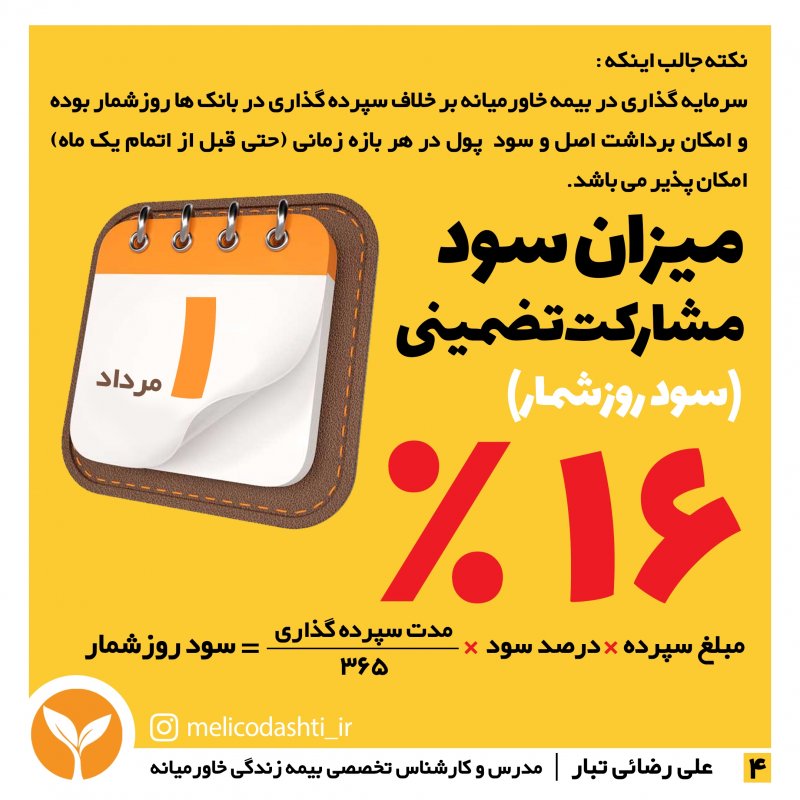 (پاسخ کامل و جامع در بخش هفتم) سود مبالغ واریز شده به اندوخته با نرخ تضمینی (۱۶ در صد برای دوسال اول، ۱۳ درصد برای دو سال دوم و ۱۰ درصد برای مابقی سال ها) محاسبه و به صورت روز شمار واریز میشود. سود مشارکت در منافع نیز پس از برگزاری مجمع سالانه(تیرماه) شرکت به اندوخته بیمهگذاران واریز میگردد. شایان ذکر است که در پورتال بیمهگذاران مبالغ سود روزشمار و سود مشارکت قابل مشاهده است. بله . قابلیت برداشت اصل و سود پول در هر زمان از روز از طریق پورتال بیمه گذاران امکان پذیر می باشد.