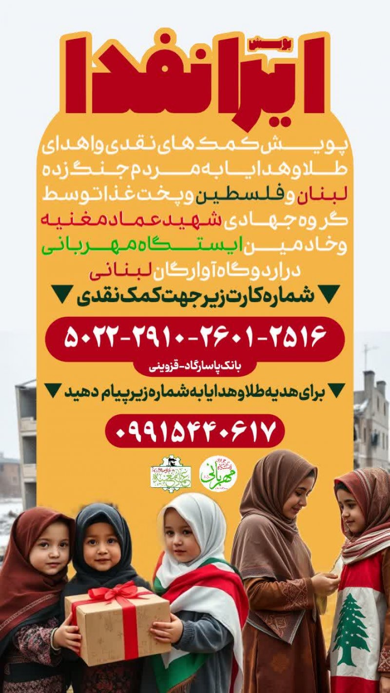 #پویش #ایرانفدا 🔸 طبق روال همیشه این بار نیز وقت آن رسیده است که اعضای محترم ایستگاه مهربانی ، مردم عزیز و جنگ زده لبنان و غزه را یاری نماییم . این طرح با همکاری گروه جهادی شهید عماد مغنیه انجام خواهد شد . ان شالله هدایای نقدی و غیر نقدی خود را از جمله (طلا و خشکبار و پتو نو و ملحفه توپی نو و کنسرو ) اعلام و هماهنگ تا جهت جمع آوری اقدام شود. در حال حاضر آشپزخانه پخت غذا برقرار است که به زودی تیم اعزامی اقدام به پخت در محل اردوگاه میهمانان لبنانی و فلسطینی مینمایند . مایحتاج اولیه و الزامی نخود ۱۵۰۰ کیلو گرم لوبیا ۱۵۰۰ کیلو گرم روغن ۱۰۰۰ کیلو گرم سیب زمینی ۳۵۰۰ کیلو گرم پیاز ۱۲۰۰ کیلو گرم بلغور ۵۰۰ کیلو گرم 📲 نحوه مشارکت واریز نقدی برای کمک به مردم فلسطین و لبنان شماره کارت: ۵۰۲۲۲۹۱۰۲۶۰۱۲۵۱۶ بانک پاسارگاد-قزوینی 📲جهت مشارکت غیر نقدی و اهدای طلا و هدایا به شماره زیر پیام دهید. ۰۹۹۱۵۴۴۰۶۱۷ خادم ایستگاه قزوینی •┈┈••••✾•🌿🌺🌿•✾•••┈┈• #ایستگاه_مهربانی #تمام_سال_را_باید_اربعینی_زندگی_کنیم