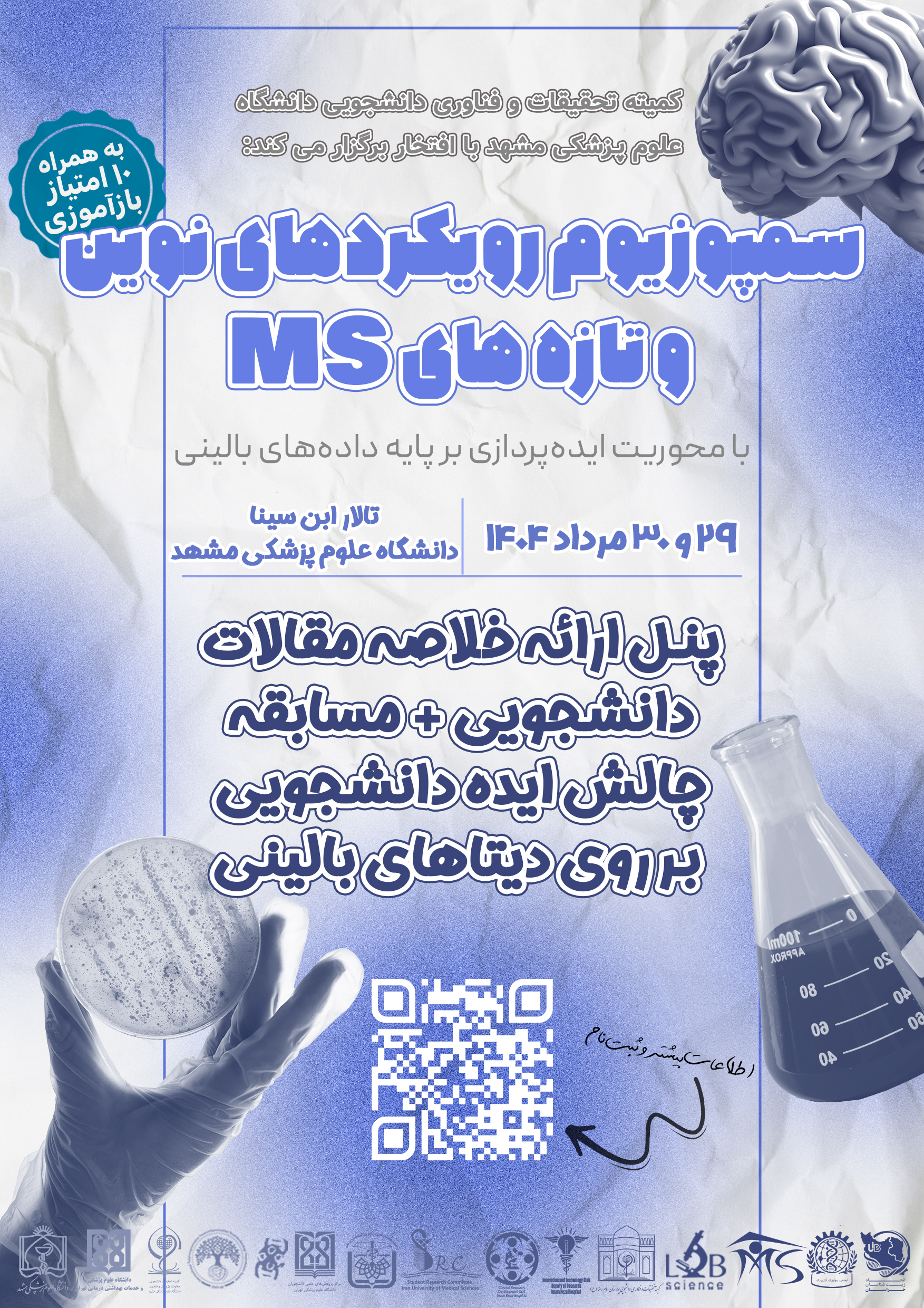 🔰 کمیته تحقیقات و فناوری دانشجویی دانشگاه علوم پزشکی مشهد و گروه مطالعاتی INEU4s با همکاری مرکز پژوهش های علمی دانشگاه علوم پزشکی تهران، کمیته تحقیقات و فناوری دانشجویی دانشگاه علوم پزشکی شهید بهشتی و ایران برگزار می کنند: ❇️ سمپوزیوم رویکردهای نوین و تازههای MS 💡 با محوریت ایدهپردازی بر پایه دادههای بالینی ⌛ مروری بر جدیدترین یافته های پاتوفیزیولوژی، اپیدمیولوژی، اتیولوژی، ژنتیکی و تصویربرداری در تشخیص و درمان ام اس از سطح مولکولی تا بالین 🔼 با معرفی برگزیدگان جهت منتورینگ و نگارش مقالات علمی منتج از داده های بالینی تحت نظارت مرکز تحقیقات MS دانشگاه علوم پزشکی تهران ➕ به همراه پنل ارائه خلاصه مقالات دانشجویی و مسابقه چالش ایده دانشجویی بر روی دیتاهای بالینی 🗓 ۲۹ و ۳۰ مردادماه ۱۴۰۴ 📍 تالار ابن سینا دانشگاه علوم پزشکی مشهد ‼️ آخرین مهلت ارسال خلاصه مقالات دانشجویی و ارسال پیش پروپوزال مسابقه چالش ایده دانشجویی تا ساعت ۲۴ روز جمعه ۲۴ مردادماه تمدید شد. این مهلت به هیچ عنوان قابل تمدید نمی باشد. 🔔 به همراه ۱۰ امتیاز بازآموزی