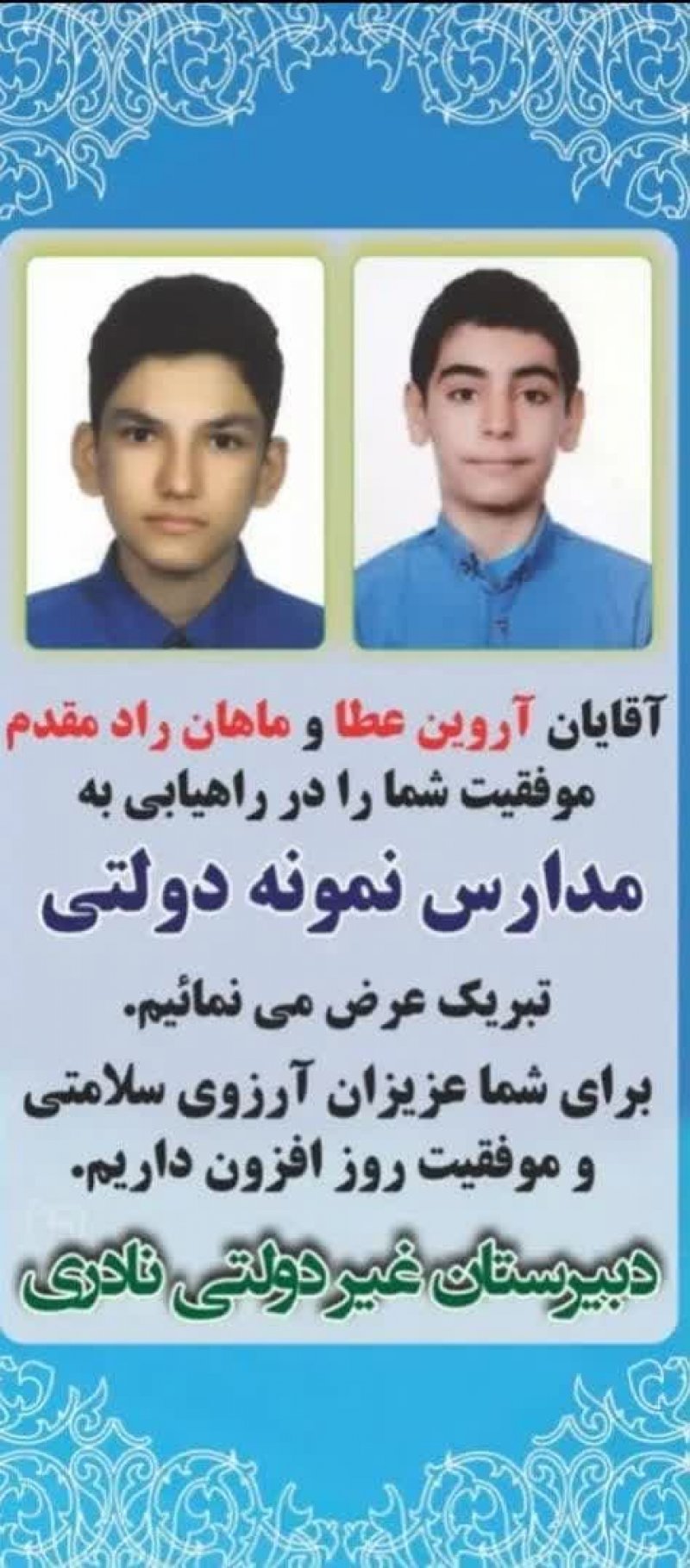 🎓 مجتمع آموزشی نادری - جایی که مثل خانوادهای بزرگ و صمیمی هستیم! 🌟 سلام! به مجتمع آموزشی نادری خوش آمدید! اینجا جاییه که یادگیری و رشد در فضایی پر از محبت و صمیمیت انجام میشه. ما مثل یک خانواده بزرگ هستیم که هر روز با هم یاد میگیریم، خلاقیتهامون رو به اشتراک میگذاریم و پیشرفت میکنیم. 🔍 چرا نادری؟ - فضای دوستانه و صمیمی: ما باور داریم که محیط آموزشی باید پر از عشق و حمایت باشه. اینجا، همه مثل برادر و خواهر کنار هم هستیم. - یادگیری خلاقانه: از کلاسهای درس جذاب گرفته تا کارگاههای هنری و پروژههای گروهی، همه چیز برای پرورش خلاقیت شما فراهمه. - فعالیتهای مشترک و هیجانانگیز: با شرکت در مسابقات، اردوها و برنامههای تفریحی، تجربههای فراموشنشدنی خواهید داشت. - تجهیزات مدرن و بهروز: ما از بهترین فناوریها و تجهیزات آموزشی استفاده میکنیم تا شما بهترین آموزش رو دریافت کنید. - اساتید مهربان و حرفهای: معلمهای ما نهتنها در کارشون حرفهای هستن، بلکه همیشه با روی باز و محبت کنار شما هستن. 💡 در مجتمع آموزشی نادری، یادگیری یعنی عشق، خلاقیت و صمیمیت. 📚 با ما همراه شوید و بخشی از خانواده بزرگ نادری باشید! ❤️ اینجا جاییه که همه با هم رشد میکنیم و به هم کمک میکنیم تا بهترین نسخه خودمون باشیم.