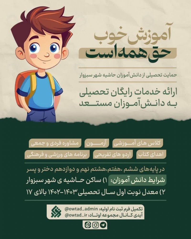 هدف : پرورش نوجوانان نخبهیِ معتقدِ دغدغهمند برقراری هر چه بیشتر #عدالت_آموزشی با کمک به کودکان و نوجوانان برای ادامه تحصیل یا فراگیری مهارت با توجه به علاقه و استعداد