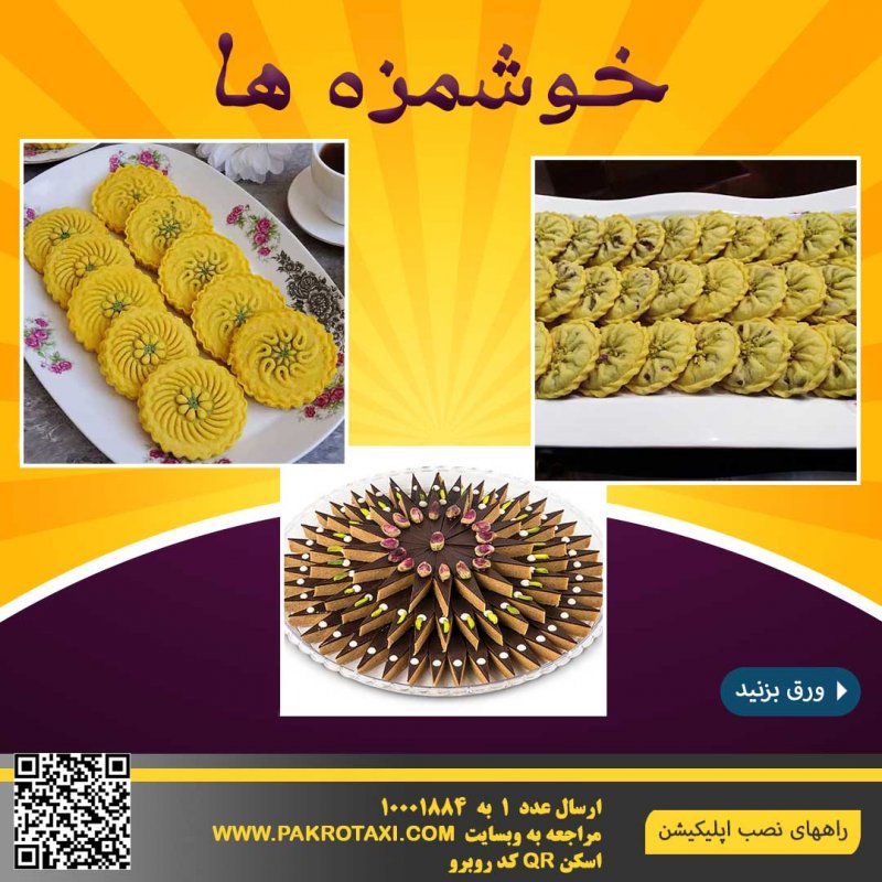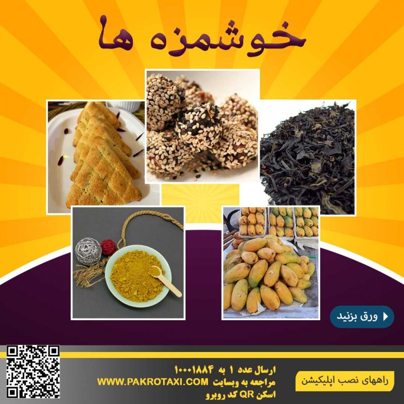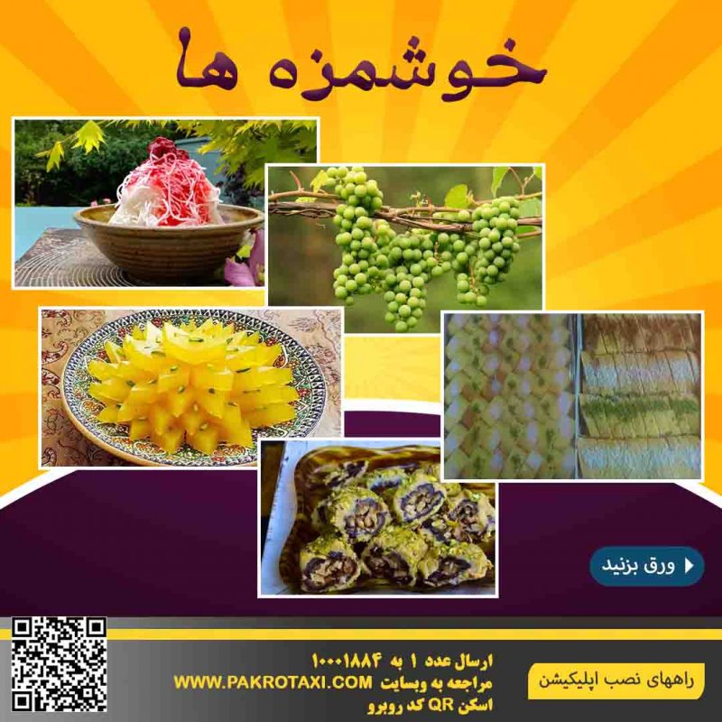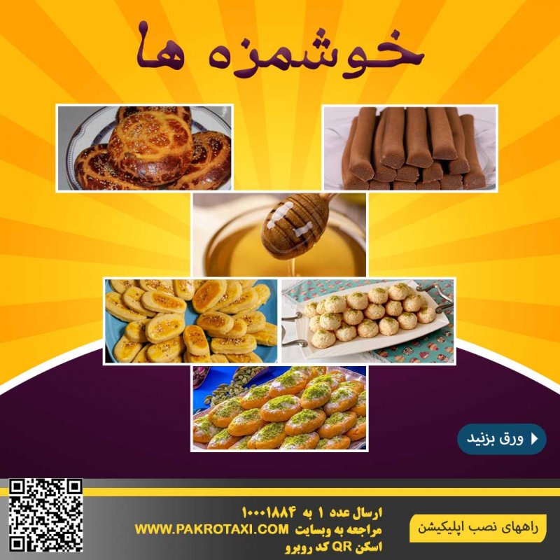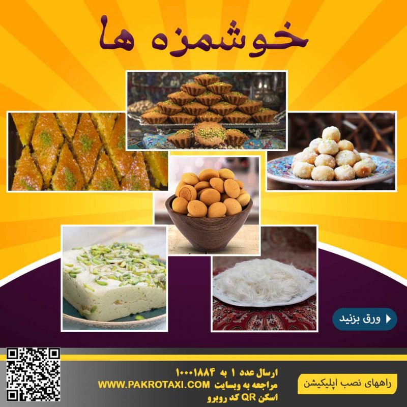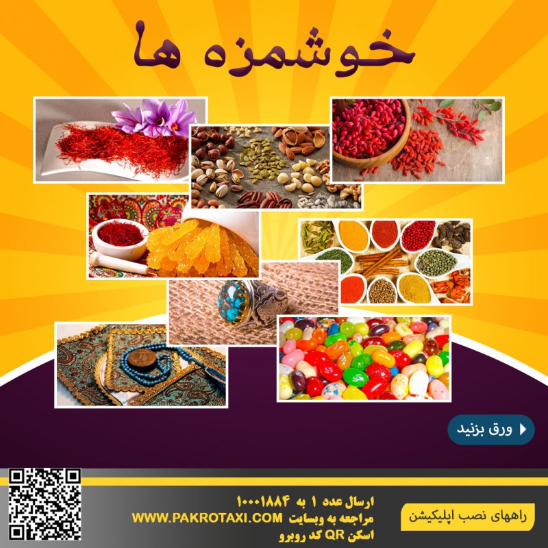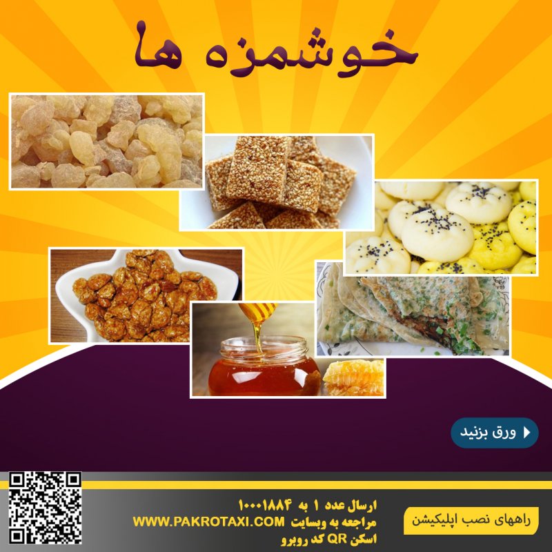 هر سه شنبه معرفی یه خوراکی خوشمزه ی جذاب😍زعفران، زرشک، نبات، آجیل خشکبار، مهر و سجاده، فیروزه، ادویه و جیلی بیلی🔸🔸🔶 این خوراکی ها مربوط به شهر مشهد است. ما که دلمون رفت برای این خوراکی های خوشمزه شما چطور؟ 😋😋با پاکروتاکسی سفر خاطره انگیز را به شهرهای ایران تجربه کنید 🚖🚖🚖
