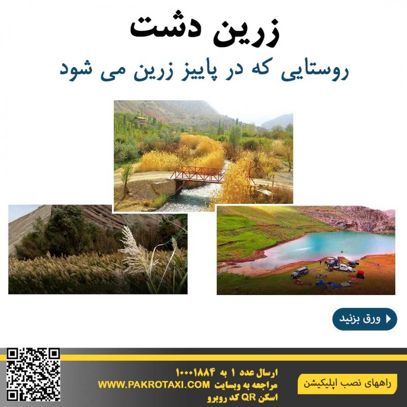 هر پنجشنبه معرفی یه جای دیدنی😍 زرین دشت، روستایی که در پاییز زرین می شود🔸🔸🔶 اگر تمایل دارید از تهران به روستای زرین دشت برسید یکی از مسیر های پیش رویتان از بزرگراه یاسینی خواهد بود که از این بزرگراه تا روستا مسافتی معادل ۱۲۰ کیلومتر پیش رویتان قرار دارد. بدین منظور ابتدا باید خود را به بزرگراه یاسینی برسانید و بعد وارد آزادراه تهران-پردیس شوید و سپس مسیر جاده فیروزکوه را در پیش بگیرید. از این جاده خود را به جاده زرین دشت برسانید و تا رسیدن به مقصد راه را ترک نکنید. شما بدون ترافیک در حدود یک ساعت و نیم در راه خواهید بود. سفری راحت و ایمن به همراه خانواده با تاکسیهای اکو، اکو پلاس، وی ای پی، ون و... را تجربه کنید.