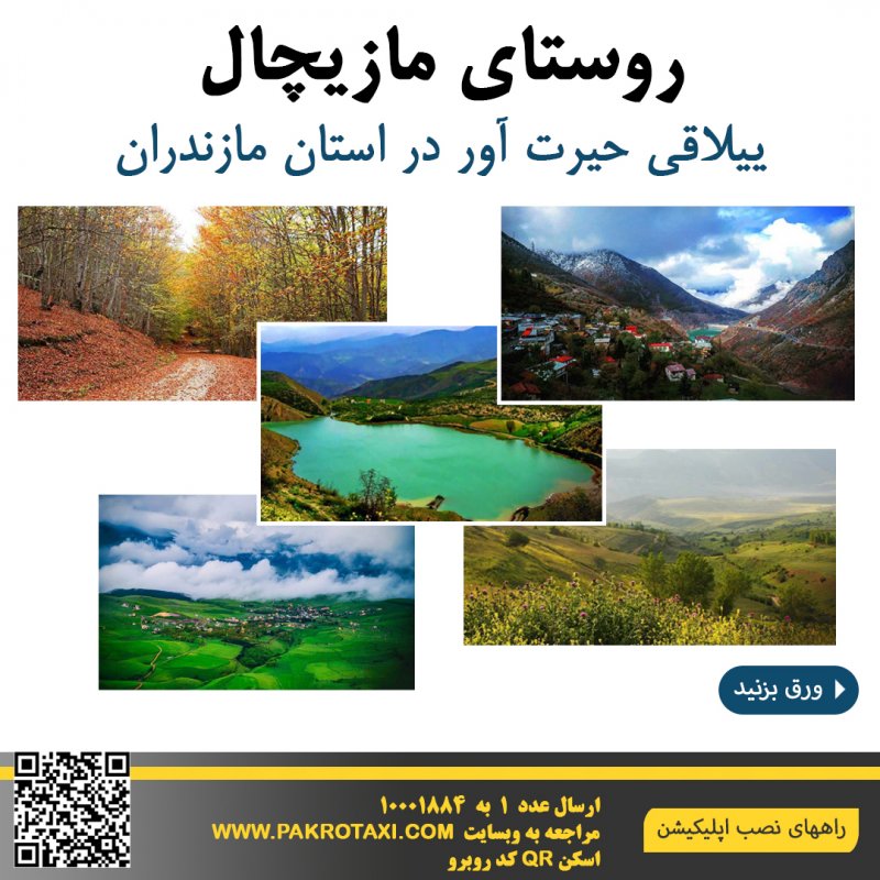 هر پنجشنبه معرفی یه جای دیدنی😍 روستای مازیچال، ییلاقی حیرت آور در استان مازندران🔸🔸🔶 برای رفتن به این روستای زیبا، ابتدا باید به جاده چالوس رفته و بعد به مرزن آباد برسید. کمی جلوتر از جاده مرزن آباد، کلاردشت قرار دارد که با دیدن تابلوهای راهنمایی آن میتوانید وارد کلاردشت شوید. بعد از اینکه به کلاردشت رسیدید، وارد جاده عباس آباد شده و در اواسط جاده عباس آباد و روستای طویدره به مازیچال میرسید. بد نیست بدانید که فاصله این روستا تا تهران حدود ۱۷۰ کیلومتر و تا جاده چالوس حدود ۴۸ کیلومتر است. سفری راحت و ایمن به همراه خانواده با تاکسیهای اکو، اکو پلاس، وی ای پی، ون و... را تجربه کنید 🚖🚖🚖