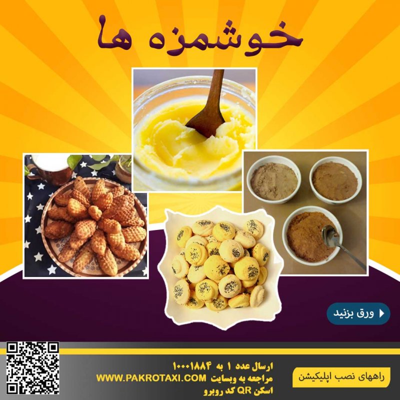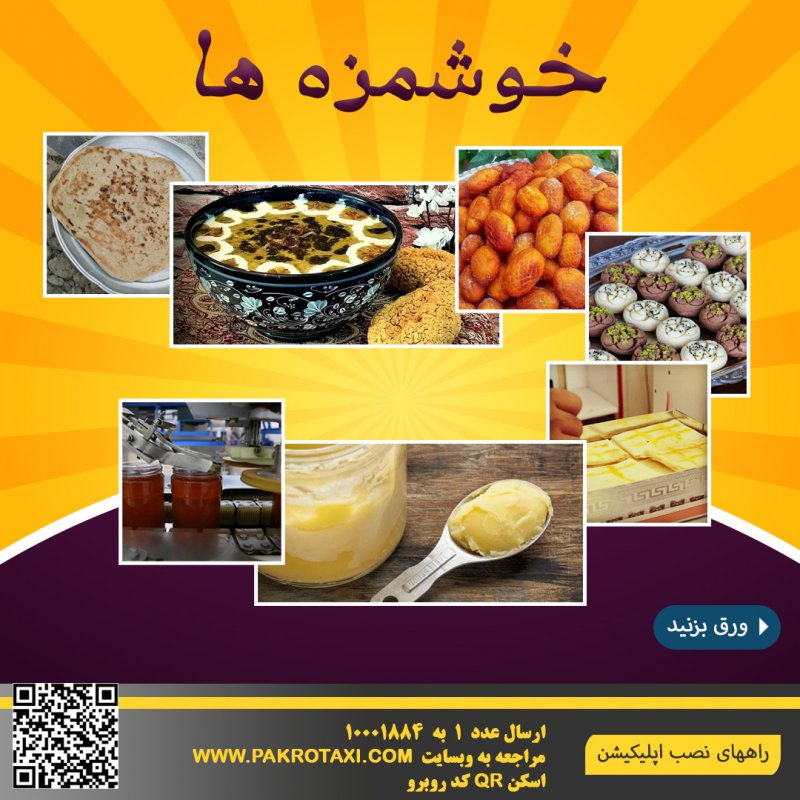 هر سه شنبه معرفی یه خوراکی خوشمزه ی جذاب😍نان ساجی، ترخینه، برساق، شیرینی آردی، شیرینی کاک، روغن حیوانی و عسل🔸🔸🔶 این خوراکی ها مربوط به شهر خرم آباد است. ما که دلمون رفت برای این خوراکی های خوشمزه شما چطور؟ 😋😋با پاکروتاکسی سفر خاطره انگیز را به شهرهای ایران تجربه کنید 🚖🚖🚖