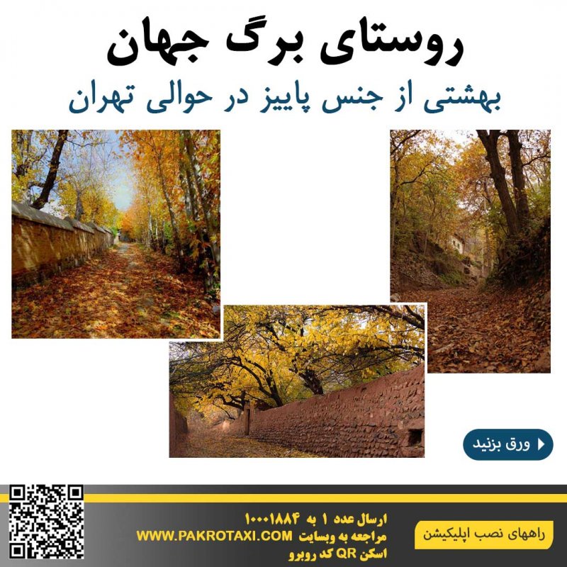هر پنجشنبه معرفی یه جای دیدنی😍 روستای برگ جهان، بهشتی از جنس پاییز در حوالی تهران🔸🔸🔶 یکی از مزیتهای روستای برگ جهان نزدیکی به منطقه لواسان و روستای افجه است. به همین دلیل میتوانید در سفر پاییزی اطراف تهران، مدتی را در هر یک از این مناطق سپری کنید. برگ جهان ۴۰ کیلومتر با تهران فاصله دارد و از طریق دو مسیر میتوان به این روستا رسید. یکی از مسیرها از لواسانات بهسمت برگ جهان میرود و دیگری از سد لتیان عبور میکند. سفری راحت و ایمن به همراه خانواده با تاکسیهای اکو، اکو پلاس، وی ای پی، ون و... را تجربه کنید 🚖🚖🚖