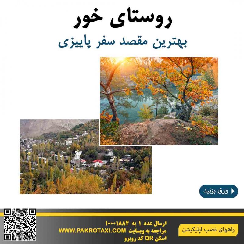 هر پنجشنبه معرفی یه جای دیدنی😍 روستای خور، بهترین مقصد سفر پاییزی🔸🔸🔶 روستای خور چالوس در فاصله ای بسیار کم از تهران و کرج قرار داشته و جاده خور قبل از سد کرج است. فاصله خور از جاده چالوس تنها ۲ کیلومتر است و برای رسیدن به خور باید قبل از رسیدن به تاسیسات سد کرج به سمت جاده روستای خور حرکت کنید. سفری راحت و ایمن به همراه خانواده با تاکسیهای اکو، اکو پلاس، وی ای پی، ون و... را تجربه کنید 🚖🚖🚖