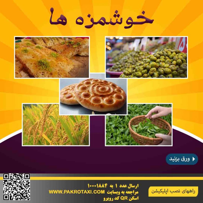 هر سه شنبه معرفی یه خوراکی خوشمزه ی جذاب😍برنج، زیتون، چای لاهیجان، کلوچه و رشته خشکار🔸🔸🔶 این خوراکی ها مربوط به استان گیلان است. ما که دلمون رفت برای این خوراکی های خوشمزه شما چطور؟ 😋😋با پاکروتاکسی سفر خاطره انگیز را به شهرهای ایران تجربه کنید 🚖🚖🚖