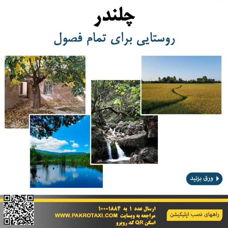 هر پنجشنبه معرفی یه جای دیدنی😍 چلندر، روستایی برای تمام فصول🔸🔸🔶 روستای چلندر در دهستان بلده کجور است و با نوشهر ۲۱ کیلومتر، با چالوس ۳۰ کیلومتر و با نور هم ۳۶ کیلومتر فاصله دارد. فاصله این روستا از تهران هم حدود دویست و پنجاه کیلومتر است. از آنجایی که خیلی از مسافرها قصد دارد یک راست از تهران به شمال بروند، این روستا با توجه به موقعیت جغرافیاییاش میتواند مقصد مناسبی برای تهرانیها باشد. سفری راحت و ایمن به همراه خانواده با تاکسیهای اکو، اکو پلاس، وی ای پی، ون و... را تجربه کنید 🚖🚖🚖
