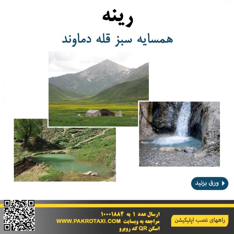هر پنجشنبه معرفی یه جای دیدنی😍 رینه، همسایه سبز قله دماوند🔸🔸🔶 رینه نزدیکترین شهر به کوه دماوند میباشد و میتوانید عکسهای تمام قد بسیار زیبایی از دماوند ثبت کنید. سفری راحت و ایمن به همراه خانواده با تاکسیهای اکو، اکو پلاس، وی ای پی، ون و... را تجربه کنید