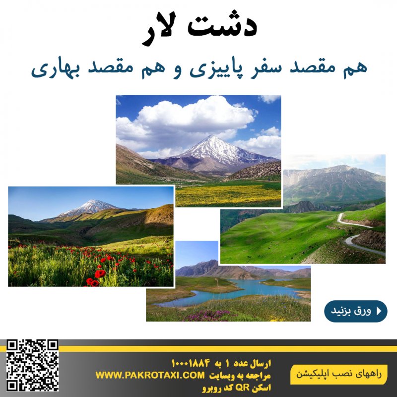 هر پنجشنبه معرفی یه جای دیدنی😍 دشت لار، هم مقصد سفر پاییزی و هم مقصد بهاری🔸🔸🔶 دشت لار، یکی از زیباترین و قشنگترین دشتهای ایران است که در مرز دو استان تهران و مازندران جای گرفته است. این دشت در طول تاریخ بهدلیل داشتن آبوهوای خنک و دلپذیر، مناظر تماشایی با گلهای زرد و شقایقهای قرمز و وجود چشمهسارهای فراوان همیشه مورد توجه قرار گرفته است. فاصله تهران تا دشت لار: ۷۰ کیلومتر. آدرس دشت لار: استان مازندران، بخش لاریجان، شهرستان آمل. سفری راحت و ایمن به همراه خانواده با تاکسیهای اکو، اکو پلاس، وی ای پی، ون و... را تجربه کنید 🚖🚖🚖