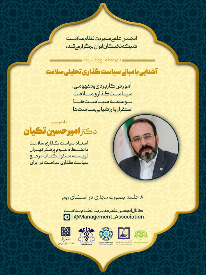 دوره جامع سیاستگذاری سلامت در ۸ جلسه به صورت مجازی برگزار میشود.در هر جلسه یکی از مفاهیم "سیاستها و سیاستگذاری سلامت" به صورت کاربردی تدریس میشود. با تدریس استاد برجسته حوزه سیاستگذاری: دکتر امیرحسین تکیان نویسنده مسئول کتاب مرجع سیاستگذاری سلامت در ایران معاون بینالملل دانشکده بهداشت دانشگاه علوم پزشکی تهران استاد سیاستگذاری سلامت دانشگاه علوم پزشکی تهران عضو هیئت رئیسه مجمع جهانی سلامت