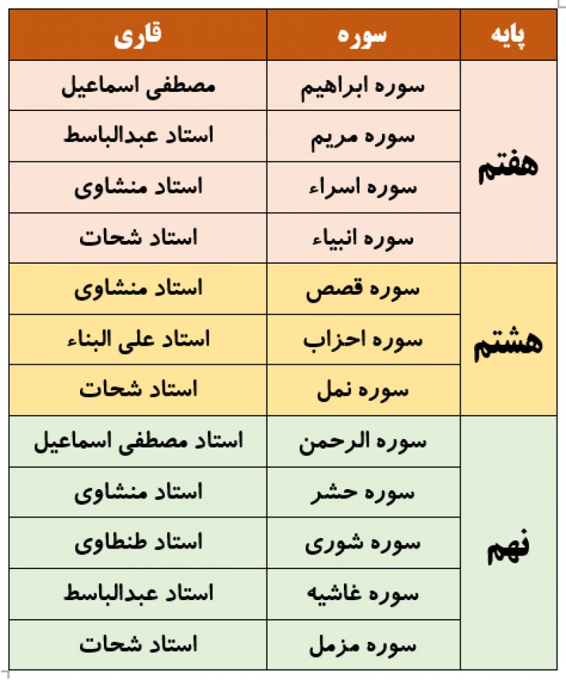 جدول الگوی تلاوت پایه های هفتم تا نهم