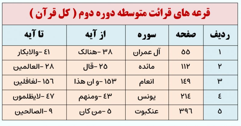 رشته الگوی تلاوت (قرائت تقلیدی) ویژه پایه های هفتم تا نهم (طبق فایل های جدول زیر) و رشته قرائت تحقیق ویژه پایه های دهم، یازدهم و دوازدهم (طبق قرعههای جدول زیر) فیلم تلاوت دانشآموزان برگزیده مدرسه باید طبق شرایط گفته شده ضبط و به نام کاربری (آی دی) مربوطه در پیام رسان شاد ارسال شود.