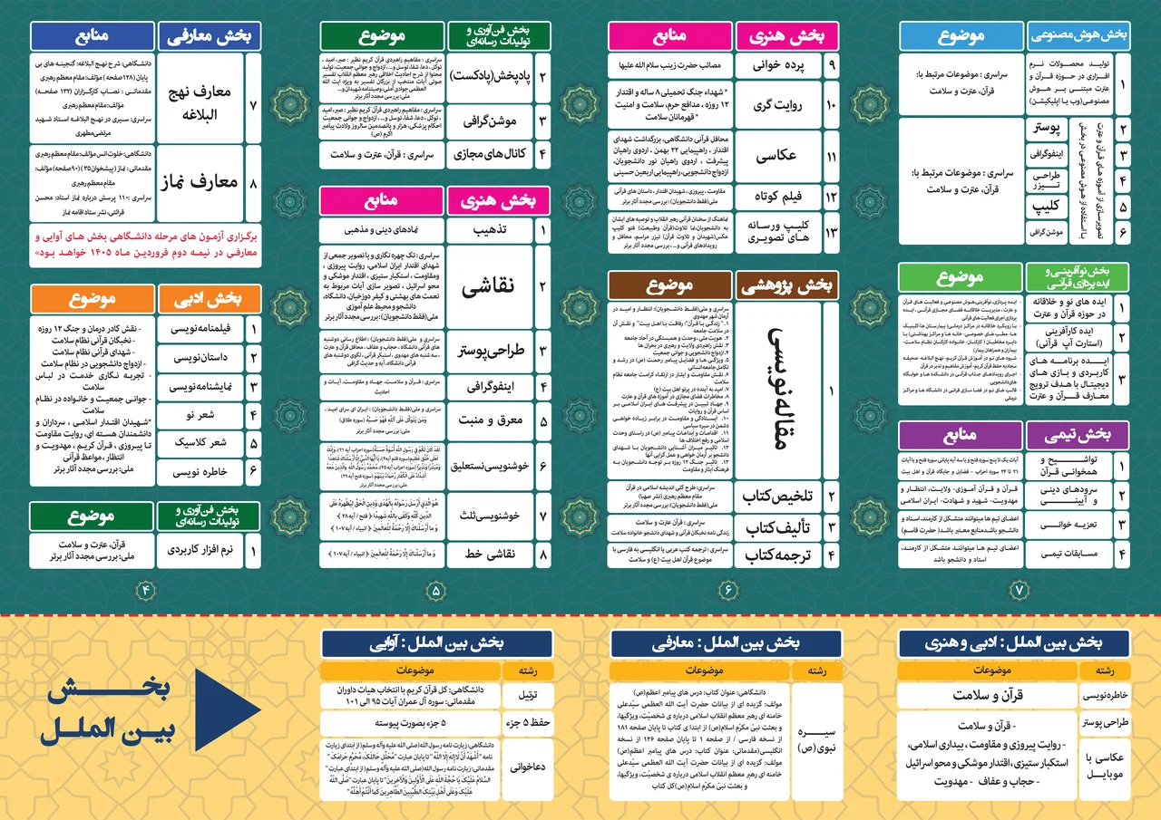 بخش آواییبخش معارفیبخش ادبیتولیدات رسانه ای و فناوریبخش نو آفرینی و ایده پردازی قرآنیبخش هنریبخش هوش مصنوعیبخش مطالعاتی و پژوهشیبخش بین الملل (ویژه دانشجویان غیر ایرانی)بخش رویداد هفتگی قرآنی و معارفی (بخش ویژه)کانال های مفید: