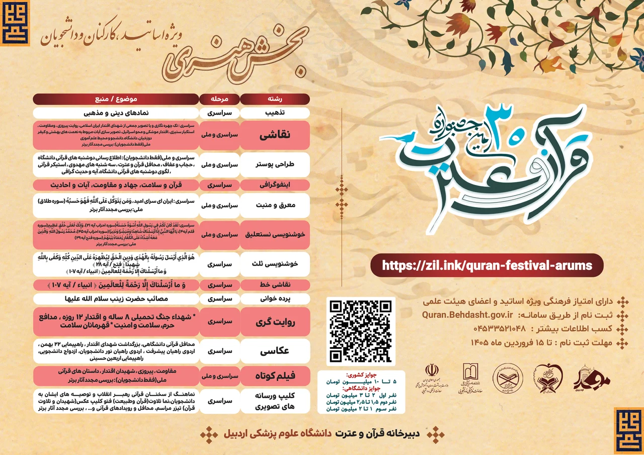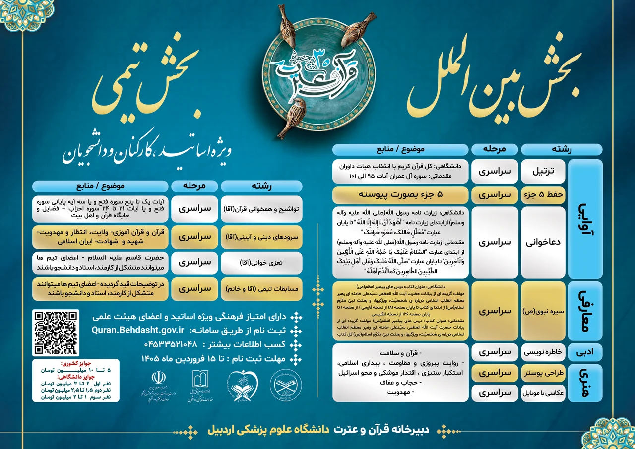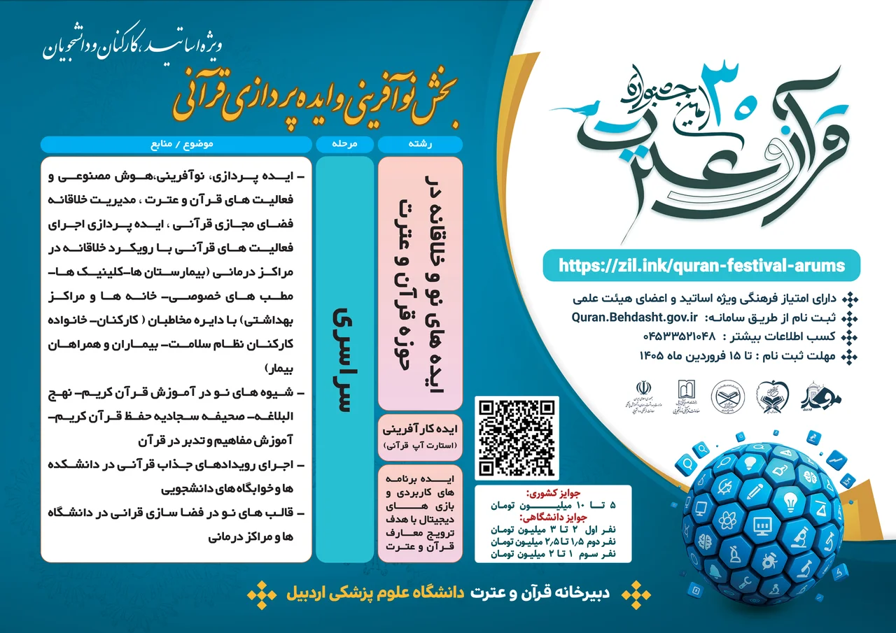 ۱. بخش آوایی سی امین جشنواره قرآن و عترت وزارت بهداشت۲. بخش ویژه سی امین جشنواره قرآن و عترت وزارت بهداشت۳. بخش ادبی سی امین جشنواره قرآن و عترت وزارت بهداشت ۴. بخش هنری سی امین جشنواره قرآن و عترت وزارت بهداشت۵. بخش معارفی سی امین جشنواره قرآن و عترت وزارت بهداشت۶. بخش تیمی سی امین جشنواره قرآن و عترت وزارت بهداشت۷. بخش بین الملل سی امین جشنواره قرآن و عترت وزارت بهداشت۸.بخش تولیدات رسانه ای و فناوری سی امین جشنواره قران و عترت وزارت بهداشت۹.بخش مطالعاتی و پژوهشی سی امین جشنواره قرآن و عترت وزارت بهداشت۱۰. بخش هوش مصنوعی سی امین جشنواره قرآن و عترت وزارت بهداشت۱۱.بخش نوآفرینی سی امین جشنواره قرآن و عترت وزارت بهداشتکسب اطلاعات بیشتر شماره تماس دبیرخانه قرآن و عترت دانشگاه علوم پزشکی اردبیل: ۰۴۵-۳۳۵۲۱۰۴۸