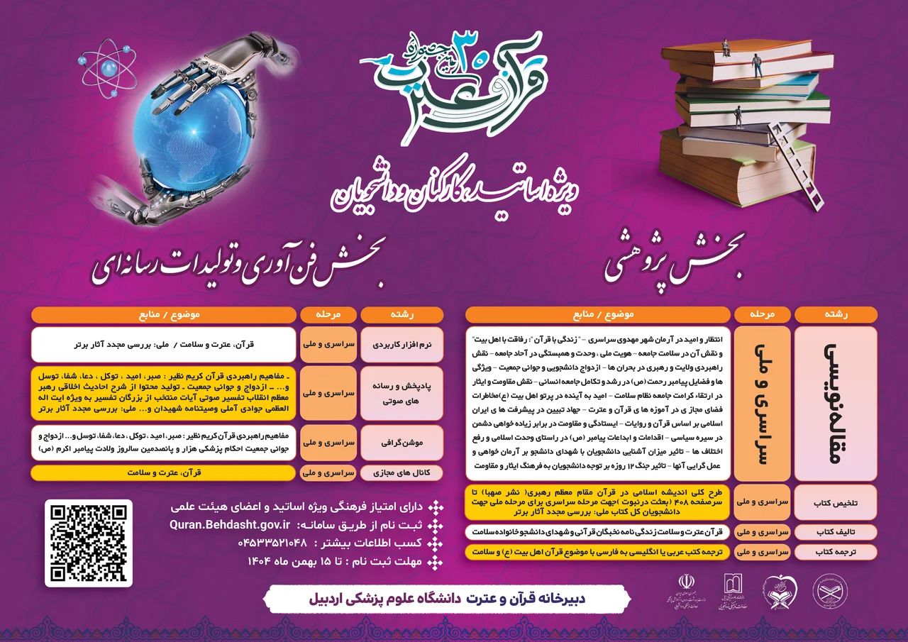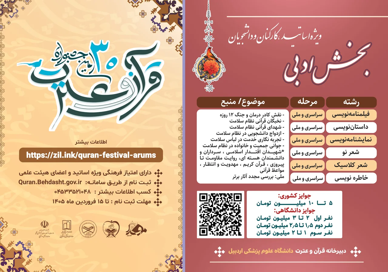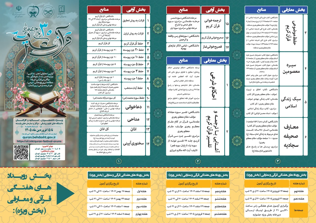 ۱. بخش آوایی سی امین جشنواره قرآن و عترت وزارت بهداشت۲. بخش ویژه سی امین جشنواره قرآن و عترت وزارت بهداشت۳. بخش ادبی سی امین جشنواره قرآن و عترت وزارت بهداشت ۴. بخش هنری سی امین جشنواره قرآن و عترت وزارت بهداشت۵. بخش معارفی سی امین جشنواره قرآن و عترت وزارت بهداشت۶. بخش تیمی سی امین جشنواره قرآن و عترت وزارت بهداشت۷. بخش بین الملل سی امین جشنواره قرآن و عترت وزارت بهداشت۸.بخش تولیدات رسانه ای و فناوری سی امین جشنواره قران و عترت وزارت بهداشت۹.بخش مطالعاتی و پژوهشی سی امین جشنواره قرآن و عترت وزارت بهداشت۱۰. بخش هوش مصنوعی سی امین جشنواره قرآن و عترت وزارت بهداشت۱۱.بخش نوآفرینی سی امین جشنواره قرآن و عترت وزارت بهداشتکسب اطلاعات بیشتر شماره تماس دبیرخانه قرآن و عترت دانشگاه علوم پزشکی اردبیل: ۰۴۵-۳۳۵۲۱۰۴۸