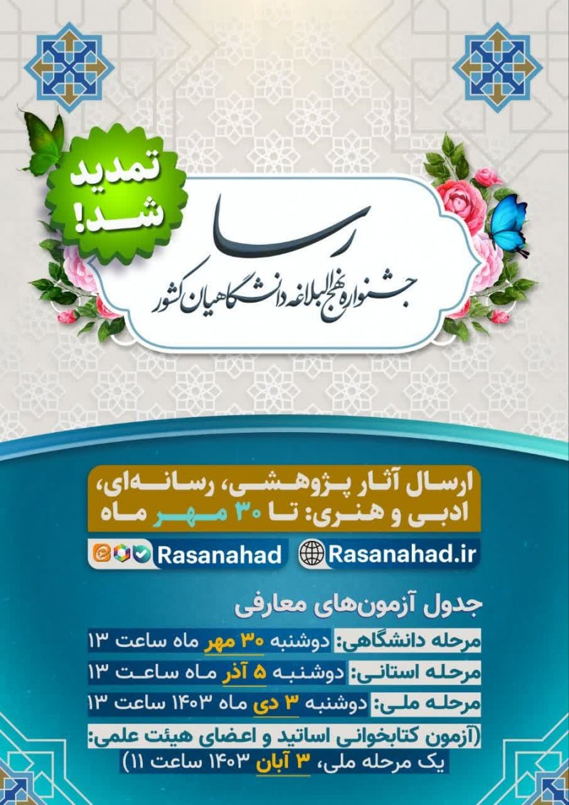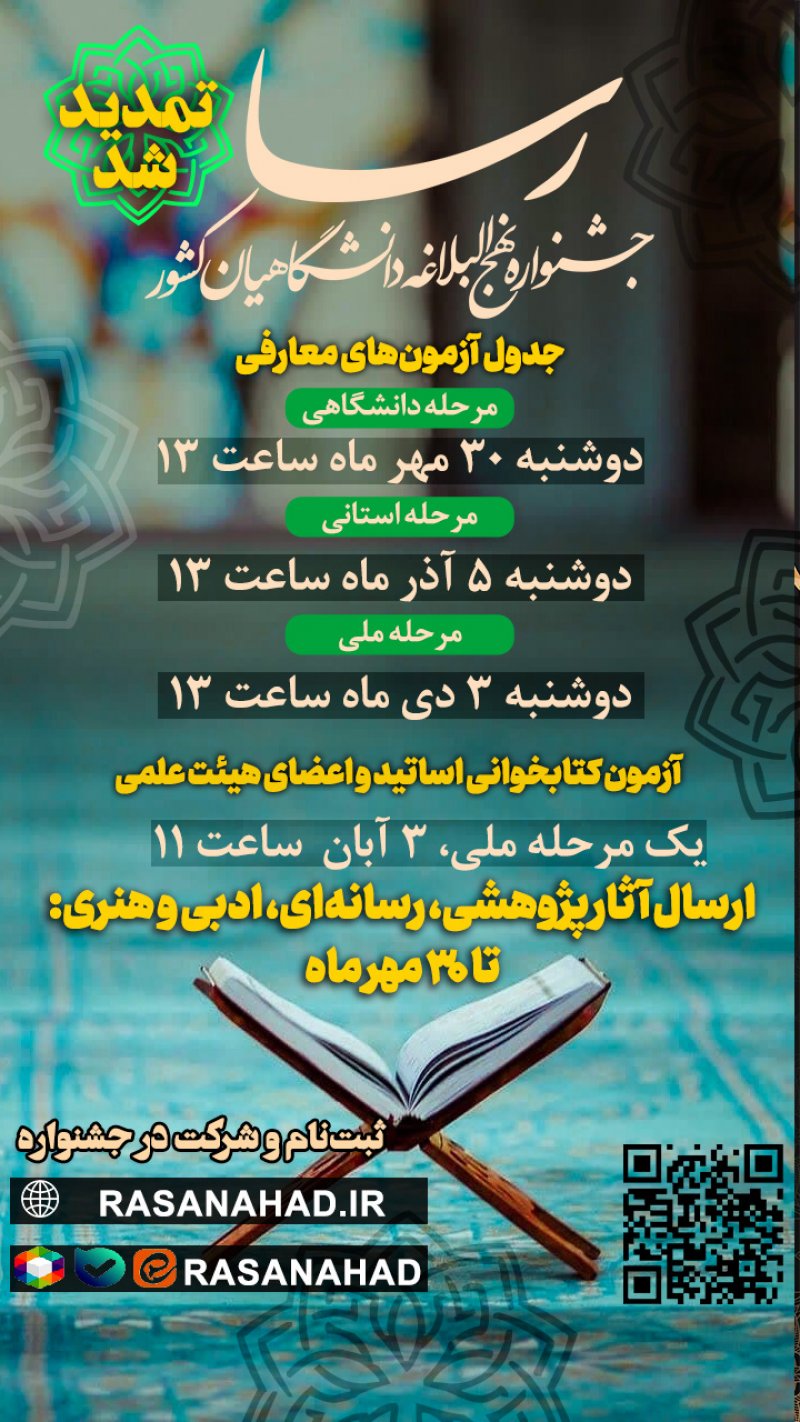 🎉فرصت شرکت در جشنواره ملی رسا تمدید شد🎉 📅 جدول زمانبندی جدید: 📝 آزمونهای معارفی (کتابخوانی، حفظ، مفاهیم): ۱️⃣ مرحله دانشگاهی: دوشنبه ۳۰ مهر ماه ساعت ۱۳ ۲️⃣ مرحله استانی: دوشنبه ۵ آذر ماه ساعت ۱۳ ۳️⃣ مرحله ملی: دوشنبه ۳ دی ماه ۱۴۰۳ ساعت ۱۳ ❇️ آزمون کتابخوانی اساتید و اعضای هیئت علمی: تنها مرحله ملی دارد، ۳ آبان ۱۴۰۳ ساعت ۱۱ 💿 ارسال آثار پژوهشی، رسانهای، ادبی و هنری: تا ۳۰ مهر ماه