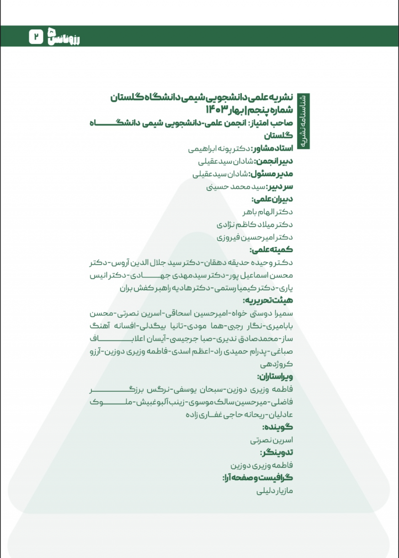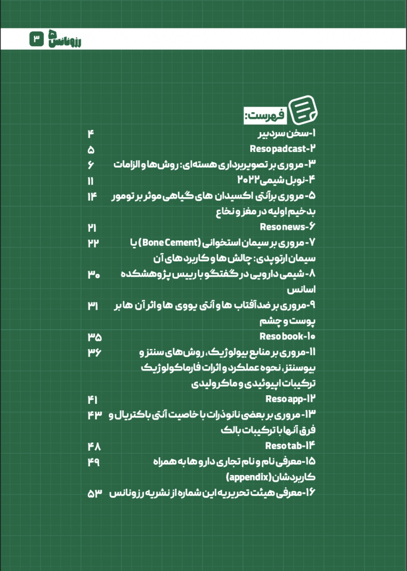 فهرست : ۱- سخن سردبیر ۲- پادکست رزونانس (Resopodcast) ۳- مروری بر تصویربرداری هستهای: روشها و الزامات ۴- نوبل شیمی ۲۰۲۲ ۵- مروری بر آنتیاُکسیدانهای گیاهی موثر بر تومور بدخیم اولیه در مغز و نخاع ۶- اخبار رزونانس (ResoNEWS) ۷- مروری بر سیمان استخوانی یا سیمان ارتوپدی: چالشها و کاربردهای آن ۸- شیمی دارویی در گفتگو با رئیس پژوهشکده اسانس ۹- مروری بر ضدآفتابها و آنتییوویها و اثر آنها بر پوست و چشم ۱۰- معرفی کتاب در حوزه شیمی دارویی (ResoBook) ۱۱- مروری بر منابع بیولوژیک، روشهای سنتز و بیوسنتز، نحوه عملکرد و اثرات فارماکولوژیک ترکیبات اپیوئیدی و مارکولیدی ۱۲- معرفی نرمافزار در حوزه شیمی دارویی (ResoApp) ۱۳- مروری بر بعضی نانوذرات با خاصیت آنتیباکتریال و فرق آنها با ترکیبات بالک ۱۴- جدول رزونانس (ResoTab) ۱۵- معرفی نام و نام تجاری داروها به همراه کاربردشان (Appendix) ۱۶- معرفی هیئت تحریریه این شماره از نشریه رزونانس
