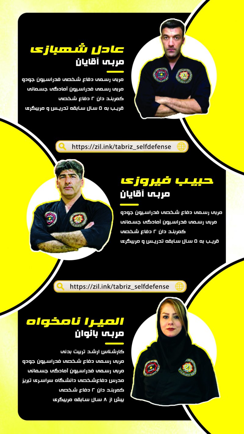 باشگاه رزمی و دفاع شخصی تبریز با تدریس و مربیگری اساتید مجرب و حرفهای تقدیم میکند. آموزش دفاع شخصی اصولی و کاربردی (آقایان - بانوان) *بدون محدودیت سنی* انواع فنون دفاع شخصی درگیری خیابانی مقابله با سلاح سرد ضربات دست و پا آمادگی جسمانی زیر نظر هیئت جودو استان آذربایجان شرقی و اعطای مدارک و احکام رسمی و معتبر فدراسیون جودو جمهوری اسلامی ایران برای هنرجویان.