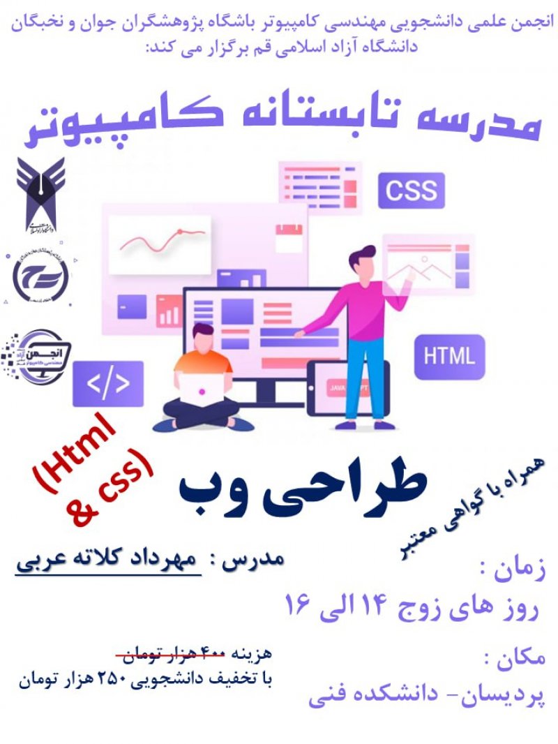 💻انجمن علمی دانشجویی مهندسی کامپیوتر باشگاه پژوهشگران جوان و نخبگان دانشگاه آزاد اسلامی قم برگزار می کند: 🔶 مدرسه تابستانه کامپیوتر 🔶 💫 کارگاه طراحی وب (Html&Css) مدرس: مهرداد کلاته عربی 🗓زمان: روز های زوج ۱۴ الی ۱۶ 🏢مکان : دانشگاه آزاد اسلامی قم -دانشکده فنی و مهندسی 🔸شروع دوره از ۳۰ تیرماه ماه به مدت ۴ هفته 💰هزینه شرکت : ۴۰۰ تومان 💳با تخفیف دانشجویی ۲۵۰ تومان ✅ همراه با گواهی معتبر جهت ثبت نام به آیدی زیر پیام دهید: @Mohadeseh_zandi 🔱 انجمن علمی مهندسی کامپیوتر دانشگاه آزاد اسلامی قم 🔱 https://zil.ink/csce_qiau