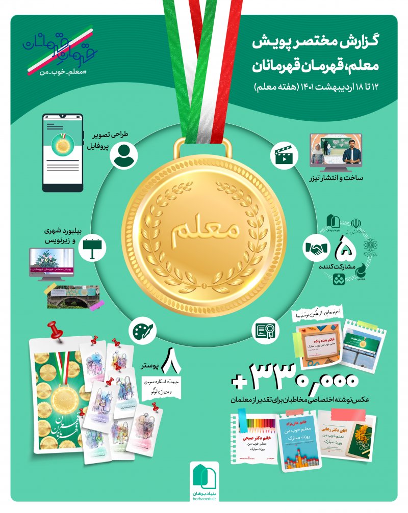 دنبال راهی بودیم که هفته معلم امسال رو بهطور ویژه به معلمها تبریک بگیم و خوشحالشون کنیم. امیدوار بودیم نتیجه تلاشهامون بشه لبخند رضایتی در گوشه چهره معلمان عزیزمون. به یاری خدا حدود ۳۴۰.۰۰۰ تقدیر از معلمان عزیز در این پویش با مشارکت گسترده مخاطبان انجام شد. شما میتوانید محتواهای تولید شده و خروجی کار رو در این صفحه ببینید.